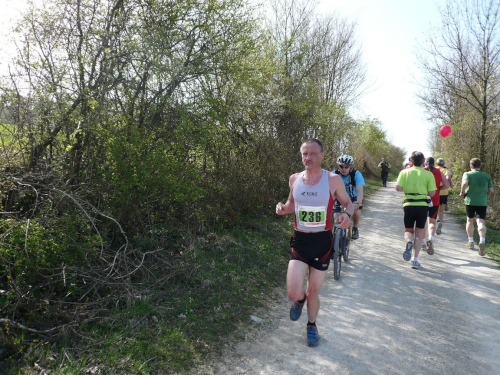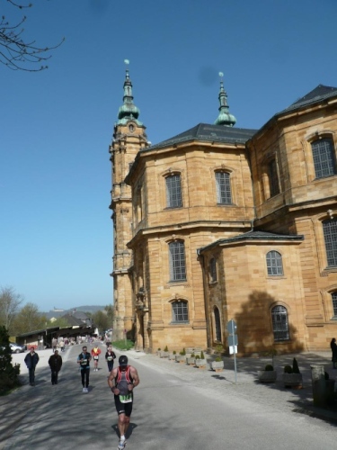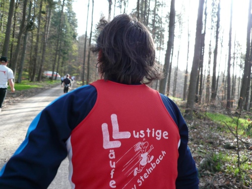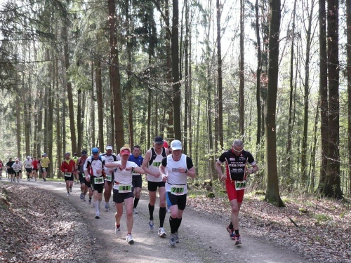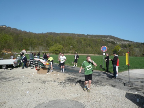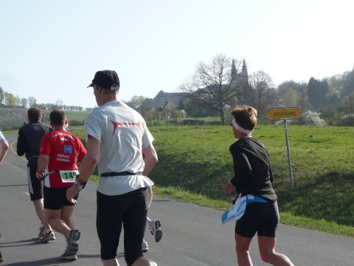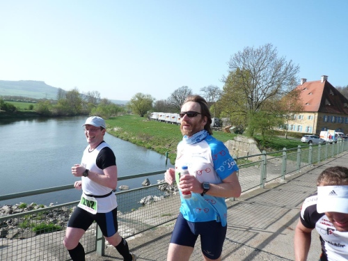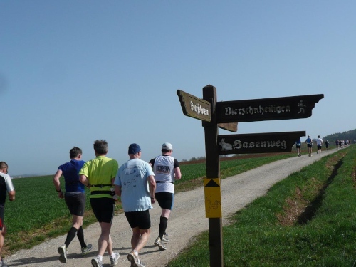 Und weiter laufen wir bergab nach Hausen hinunter, zuerst auf Asphalt, dann wieder auf befestigten Waldwegen. Manfred Ahrendts aus Herbrechtingen schickt mich vor. Er will heute in gut vier Stunden finishen. In Hausen habe ich die Vier-Stunden-Meute wieder gestellt. Jürgen Kamm ist ein Karschter Blindschleicher. Dass die blind sind, glaube ich weniger, auch nicht, dass sie dahinschleichen. Aber dass mit Karscht die Stadt Karlstadt unweit von Würzburg gemeint ist, dass weiß ich.