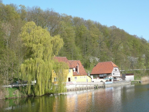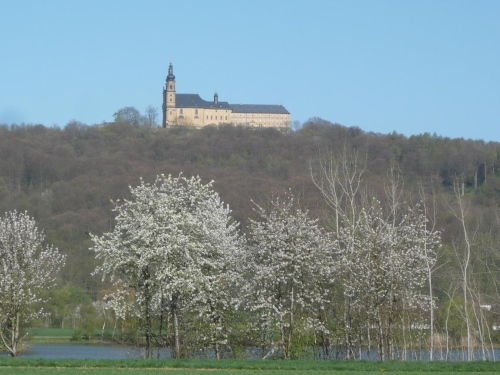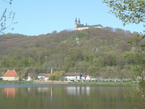 An einem Wehr überqueren wir den Main. Damit befinden wir uns auf dem gleichen Höhenniveau wie am Start. An den Reundorfer Seen finden wir immer wieder schöne Ausblicke auf Kloster Banz. Wasser, Blüten, Berge, für das Auge wird hier viel geboten. Für einen lauten Lacher bei einigen Zuschauern sorge ich bei einem Fotoshooting mit Kind und Kloster.