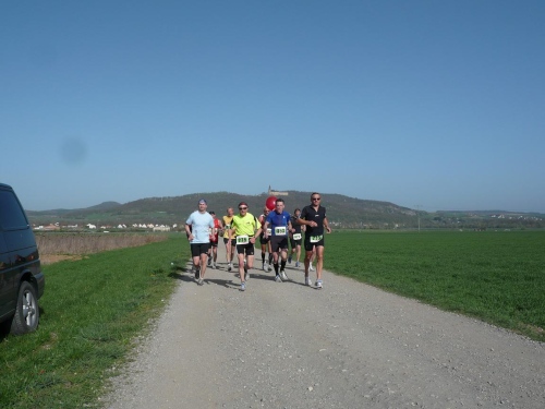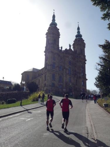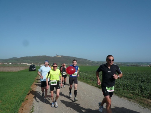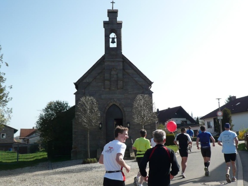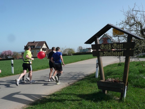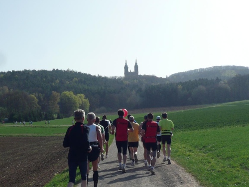 Wir durchlaufen die Orte Schönbrunn und Wolfsdorf und kommen damit unseren nächsten Ziel, der Wallfahrtskirche Vierzehnheiligen immer näher. Auf einigen Wandermarkierungen ist der Ort schon angeschrieben. In den Ortschaften sind bereits Sträucher mit Ostereiern und auch Osterbrunnen zu sehen. Rechts ginge sogar der Hasenweg ab, aber wir laufen gerade weiter. Eine leichte Steigung mit wenigen Schlaglöchern führt uns zur Verbindungsstrasse. 14 Kilometer liegen hinter uns. Am Vier-Stunden-Läufer hängen jetzt gut zehn Marathonis dran. Martin läuft wie ein Uhrwerk, während der Bodo sich immer wieder nach hinten fallen lässt, um dann wieder aufzuschließen. „Der bräucht a Goassl“, meint Martin, um die Zurückzubleibenden besser antreiben zu können.