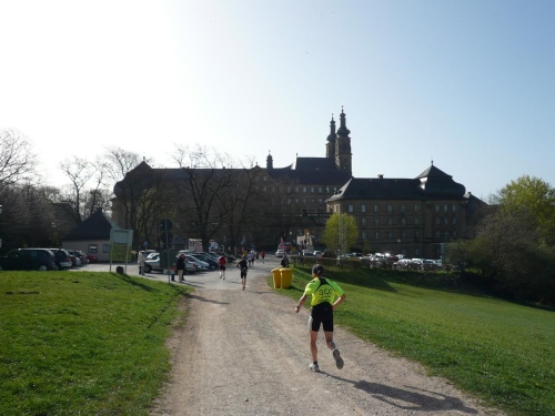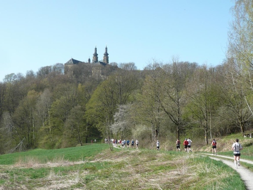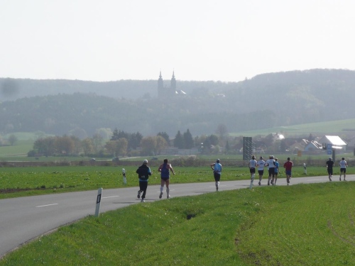 Die lange Steigung mit rund 200 Höhenmetern endet, wir sind jetzt auf dem Höhenzug angekommen. Martin braucht einen Zwischenstopp für ein kleines Geschäft und springt dann hinterher. Die nächsten Kilometer gehen wenig wellig auf gut befestigten Feldweg Richtung Staffelberg. Es dauert aber nicht lange, dann kommt uns bereits die Spitze entgegen. Uwe Bäuerlein vom TSV Staffelstein dominiert das Rennen und hat einen Riesenvorsprung vor Harald Schricker aus Stadtsteinach. Es dauert nicht lange, dann kommt uns bereits die führende Frau entgegen.