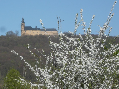 Im Sturzflug geht es auf Kloster Banz zu. Die im Barock erbaute Klosterkirche macht einen wuchtigen, überwältigenden Eindruck. Ein Besuch oder eine Führung wird sich lohnen. Für uns reicht lediglich die Zeit für ein kleines Häppchen, denn hier können wir verpflegen. Bis ich meinen Arbeitsauftrag (ein paar Bilder) erfüllt habe, ist mir Martin mit seiner Gruppe schon auf und davon. 100 Meter weiter sehe ich gerade noch seinen Luftballon.