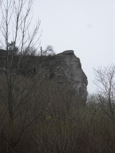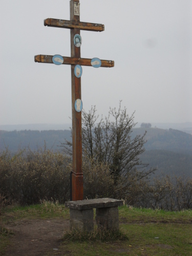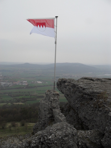 Oben laufen wir eine Plateaurunde mit rund 500 Metern, vorbei an mehreren Gipfelkreuzen. Der Blick geht an den Kanten des Berges weit in den Thüringer Wald und Rhön hinein oder entlang des Maintales fast bis Bamberg. Heute sind die Aussichten etwas getrübt, denn es fängt an zu regnen und die Temperatur fällt auf ca. 4 Grad. Nach einer kurzen Foto- und Verpflegungspause geht es weiter.
