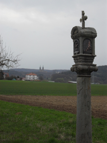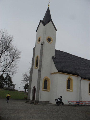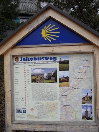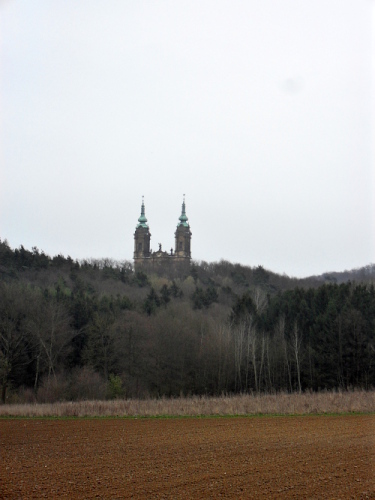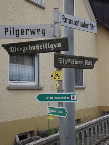 Man durchläuft dann die Orte Schönbrunn und Wolfsdorf und kommt damit dem nächsten Ziel, der Wallfahrtskirche Vierzehnheiligen, die Ihre hohen Türme aus den waldreichen Hügeln streckt, immer näher. Wie die meisten Kirchen, liegt auch diese wieder erhaben auf einer Anhöhe. Auf einigen Wandermarkierungen ist der Ort schon angeschrieben und wir benutzen hier den Pilgerweg.