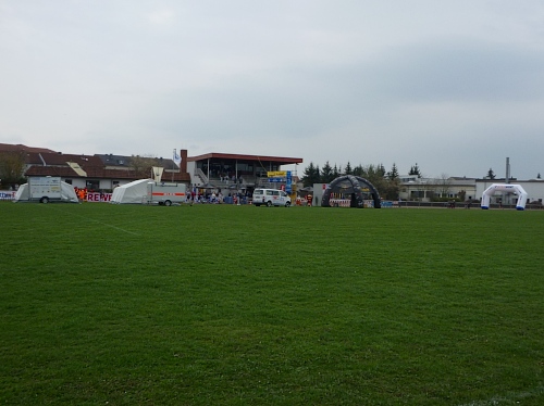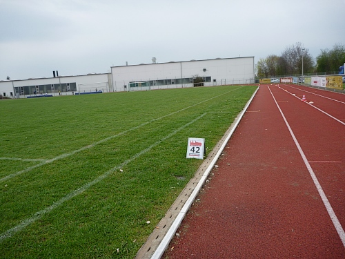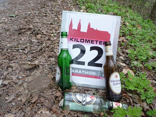 Aqua-Riese-Hallenbad, Kurpark mit seinen Salinen, wo die Kurgäste salzhaltige, statt biergeschwängerte Luft atmen sollen. Immerhin hat Bad Staffelstein 10 Brauereien aber nur 2 Salinen, dann geht es zügig ins Städtischen Stadion wo ich endlich das langersehnte 42 Kilometerschild entdecke.