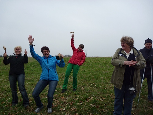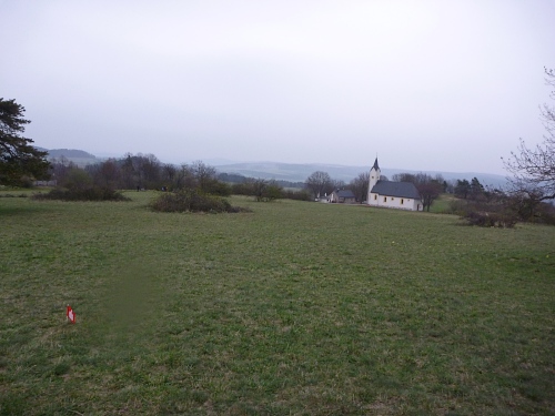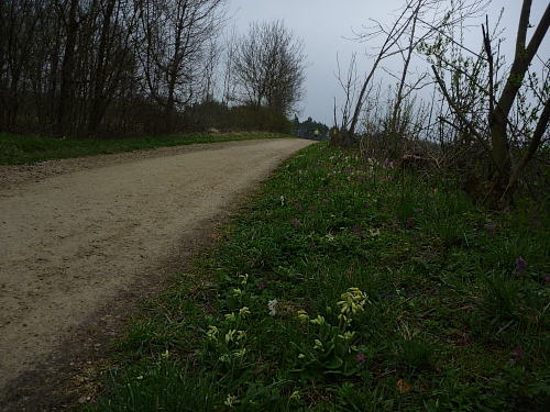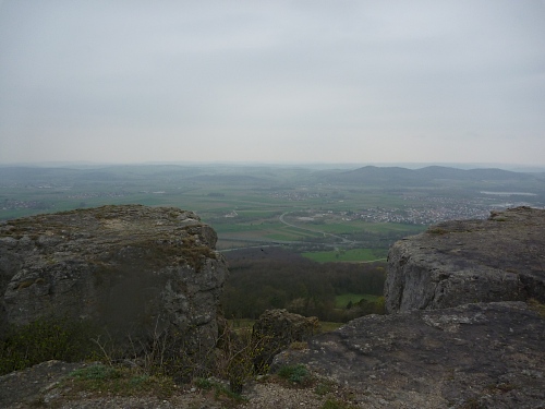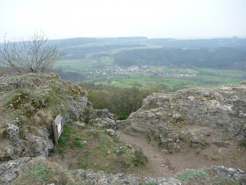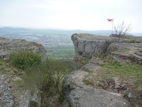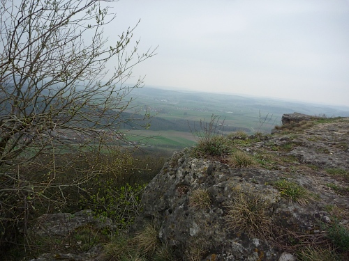 Wir laufen nicht auf dieser steilen Seite hinunter, schön wäre es, dort die gesetzlich geschützten Kalktuffquellen zu sehen. Das Wasser bringt von höheren Schichten Kalk mit, lagert es hier unten ab, sodass die Rinnsale wie kleine Kanäle aussehen. Sehr hübsch zwischen den Wiesenblumen, wo man noch reichlich Knabenkraut, die heimischen Orchideen findet.