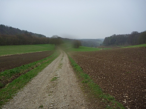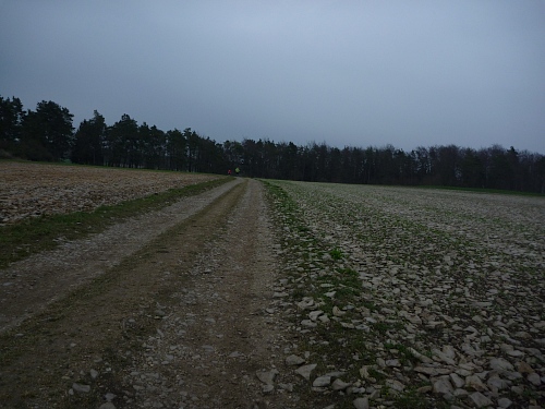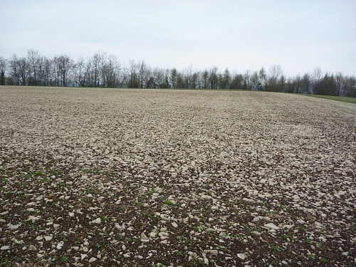 Die Felder sind nicht fruchtbar. Keimlinge der Futtererbse lugen durch das mit Millionen Steinen übersäte Feld, hier war der Fundort der rotgoldenen Goldschnecken, kleine Ammoniten, ein, bis zwei Zentimeter groß aber wunderschön und gloldbraun glänzend.