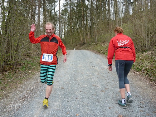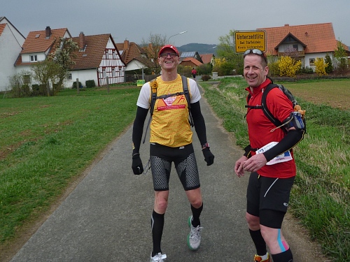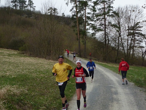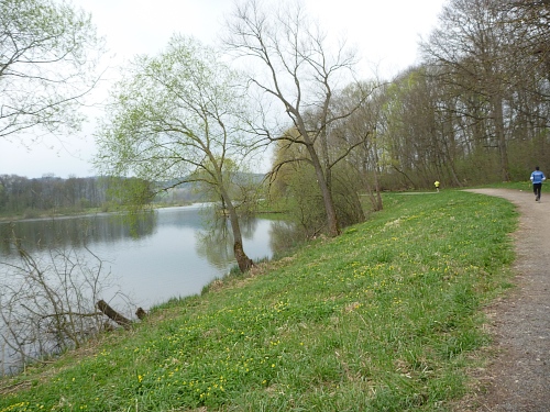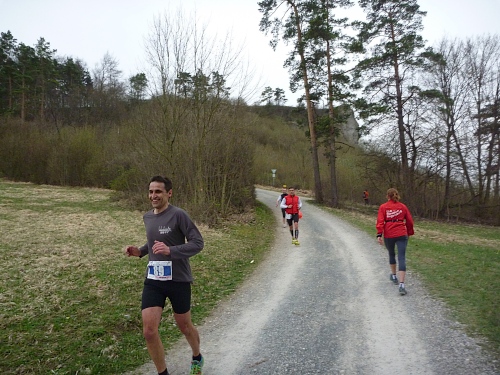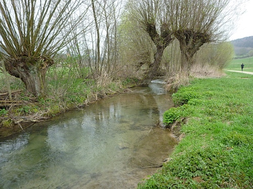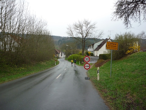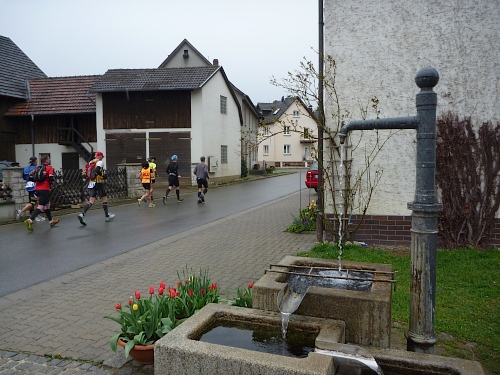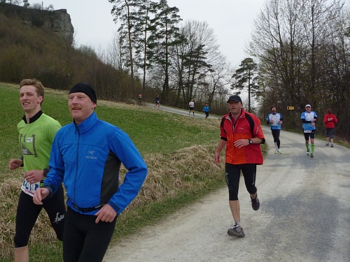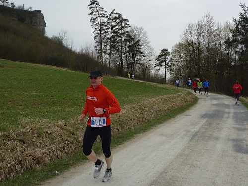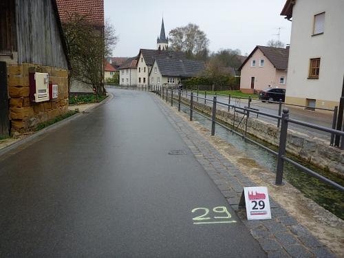 Die Begegnungstrecke ist intereressant, schließlich ist dies ein Wettkampf. Km 25, das Gossental ist schön und einsam, ich auch. Uetzing (km 28) hat acht Quellen, die alle vom karstigen Staffelstein, der selbst kein Wasser speichern kann, gespeist werden.