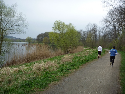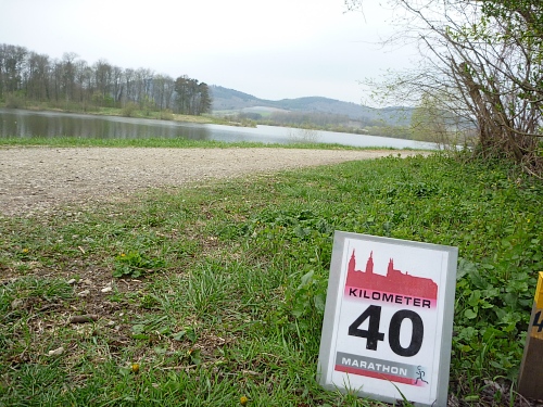 Riedsee (km 40). Ich mache ein Foto von dem Kilometerschild, da grinsen mich zwei dicke Angler an. „ Macht ihr auch Sport?“, frage ich und setze meinen Siegeszug erschöpft fort.