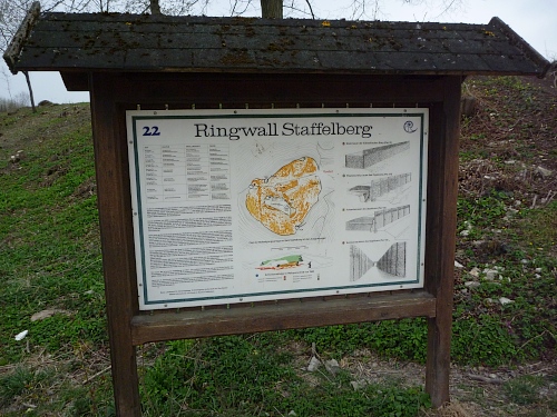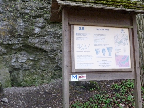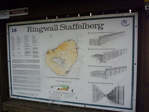 Es geht hinauf auf die Begegnungstrecke, die zum Staffelstein führt. Der Staffelstein (539 m) ist ein sogenannter Zeugenberg, ein einzelner Berg, dessen umliegende Gesteine durch Erosion abgetragen wurden. Dieser Zeugenberg erzählt von der Zeit, als dieses Gebiet von Meer bedeckt war. Zwischen Tongesteinen und Sandsteinen sind im Riffkalk Versteinerungen zu finden. Eisen entsand durch bakterielle Tätigkeit. Die Meersablagerungen sind deutlich in Schichten (Staffeln) erkennbar.