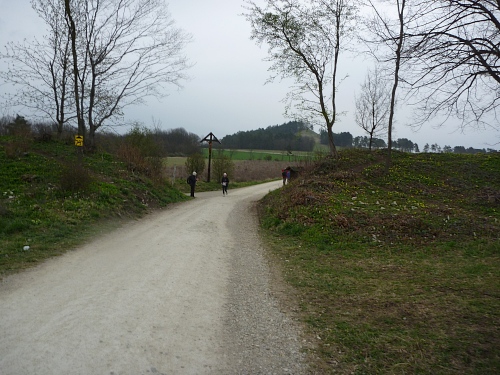 Anstieg zur Wallfahrtskirche Vierzehnheiligen (km 14) - Das Kloster wurde 1803 durch Napoleon aufgelöst (Säkularisierung) um seine deutschen Versallen mit den Besitztümern der Kirche zu belohnen. Seit 1839 wohnen hier wieder einige Franziskaner, die die Betreuung der Pilger übernommen haben. Jetzt am Sonntagmorgen gehen einige Kirchgänger hier hinauf. Die zahlreichen, mich sehr beeindruckenden Buden der Devotionalienverkäufer künden aber von einer großen Pilgerzahl in den Sommermonaten.