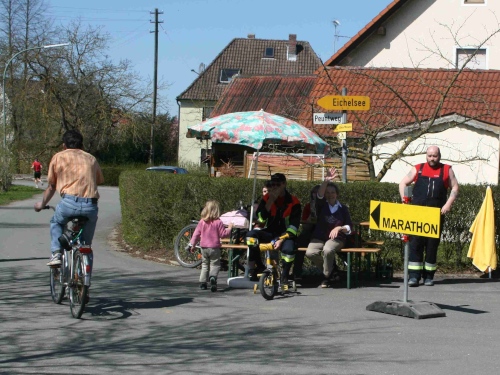 In Hausen angekommen, führte die Strecke durchs Tal über Schönbrunn und Wolfsdorf zum nächsten Höhepunkt des Marathons, Vierzehnheiligen. Zuvor konnte ich noch Charles ablichten. Er war extra aus Lousiana, USA angereist, um hier zu starten. Wie im Ziel zu erfahren war, hatte er über Google von dieser Veranstaltung erfahren. Durchs Internet wird unsere Welt halt doch immer kleiner, wenn auch immer noch erst 42,195 Kilometer einen Marathon ergeben. Eigentlich sollte er nicht der einzige Amerikaner sein, aber die Hoffnung auf eine Teilnahme von Jeff und Ingrid zerstreute sich wie die Vulkanasche in der Atmosphäre.