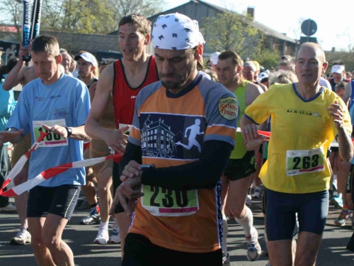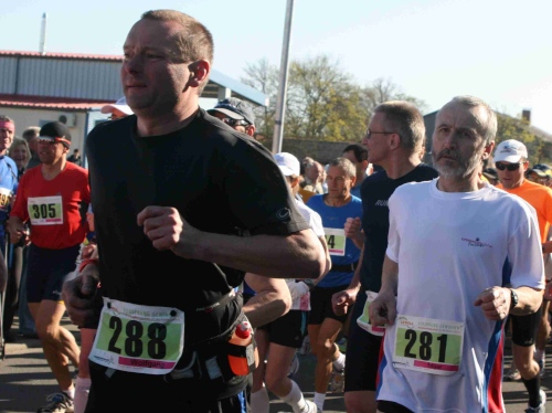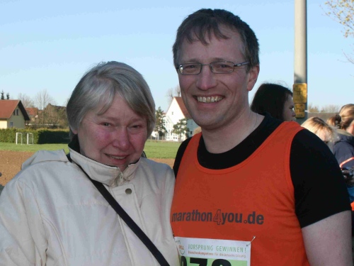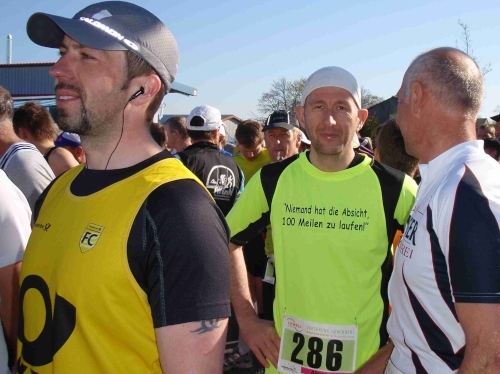 Bevor die Marathonis auf die Reise geschickt wurden, konnten diese schon mal die „Halben“ anfeuern, die 10 Minuten vorher starteten. Der Cheforganisator Karl-Heinz Drossel sorgte sogar persönlich für eine freie Bahn. Anschließend hatte ich noch die Gelegenheit, m4y Reporter Olaf Ulmer kennen zu lernen, der hier auch als Wiederholungstäter an den Start ging. Den Startschuß für den Marathonlauf gab, wie immer, Landrat Reinhard Leutner. Früher war er Bürgermeister von Staffelstein und sorgte in den 70er Jahren mit dem Heimatforscher Heiner Kohles dafür, dass hier Thermalbohrungen durchgeführt wurden. Gefunden wurde dabei die stärkste und wärmste Sole in Bayern. Damit war der Grundstein für die Obermain-Therme und den Aufstieg Staffelsteins zur Bäderstadt gelegt.