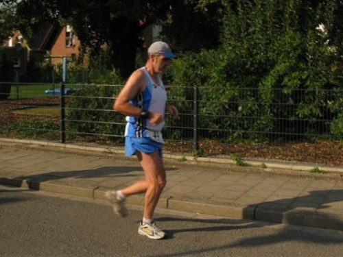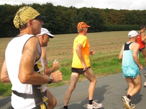 Der Abzweig in Bissendorf liegt bei KM 35 psychologisch etwas ungünstig, und mancher schaut sehnsüchtig zum naheliegenden Ziel hinüber. Aber ein Marathon beträgt nun einmal 42,195 KM, da hilft alles Jammern nichts. Die entgegenkommenden Läufer haben das Ziel schon fast erreicht. Auch Sjoerd Slaaf ist unter ihnen und grüßt nochmals freundlich.