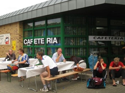 Da der Start des Marathonlaufes um 15:30 Uhr erfolgt, geht es für uns erst gegen Mittag auf die rund 150 KM Anreise. Meine Frau Inge und ihre Freundin Christiane bilden heute mit Hartmanns Frau Johanna unser Betreuungsteam. Bequem erreichen wir über die A30 Bissendorf. Von der Autobahnabfahrt sind es nur wenige hundert Meter bis zur Werscher Straße. Dort im Schulzentrum erhält man die Startunterlagen und hier werden auch Start und Ziel des Marathonlaufes sein. Schon auf dem Parkplatz treffen wir Sjoerd Slaaf aus den Niederlanden, der mit über 500 Marathonläufen zu den begeisterten Sammlern zählt.