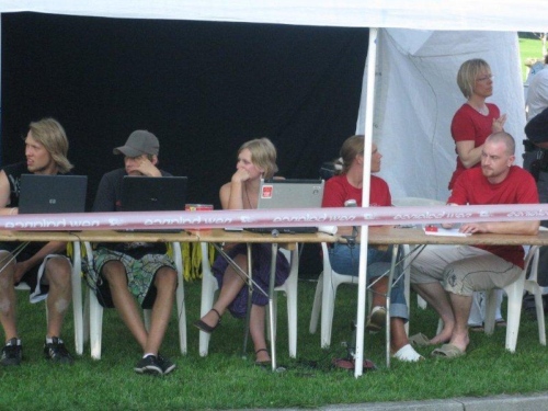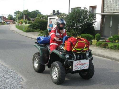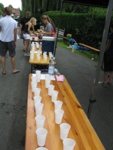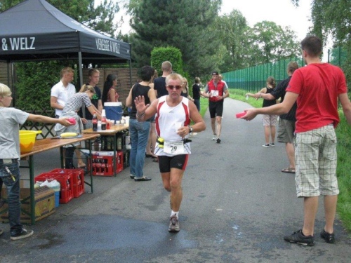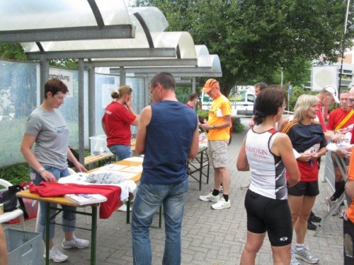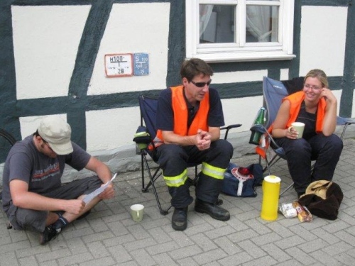 Alle 4 bis 5 Kilometer gibt es eine Verpflegungsstelle mit Wasser, Mineralgetränken und Obst. Dazwischen liegen auch noch Wasserstellen zur Abkühlung. Das Wetter ist heute mit 27 Grad zum Marathonlaufen etwas ungünstig. Sah es noch in der letzten Woche ziemlich herbstlich aus, gibt es seit gestern wieder Hochsommer. Rot Kreuz Helfer sind auf der Strecke mit dem Fahr- bzw. Motorrad dabei, und könnten so schnell Erste Hilfe leisten. Auch eine gute Idee.