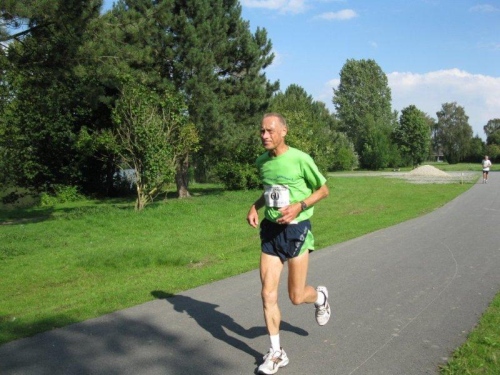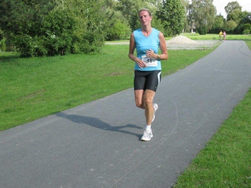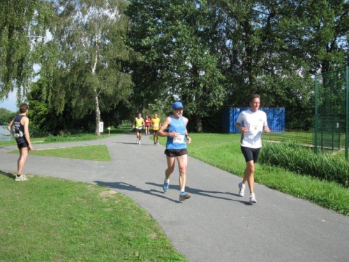 Danach geht es erst einmal über einen Feldweg bergan zu einem kleinen Wäldchen. Auf den Feldern bringen die Bauern ihre Ernte ein und die Mähdrescher wirbeln eine riesige Staubwolke auf. Da heißt es die Luft anhalten. Danach geht es leicht abwärts zuerst über einen groben Schotterweg nach Himbergen. Hier muss man schon etwas aufpassen wo man hintritt. Danach geht es wieder über eine ruhige Straße zurück nach Bissendorf. Dort hat man den Streckenverlauf zum Vorjahr leicht geändert. Jetzt laufen wir an einem kleinen See vorbei - das empfinde ich sogar als eine Verbesserung.
