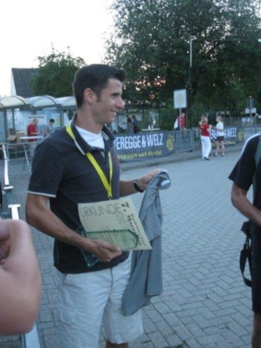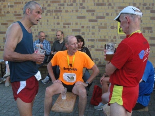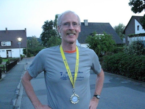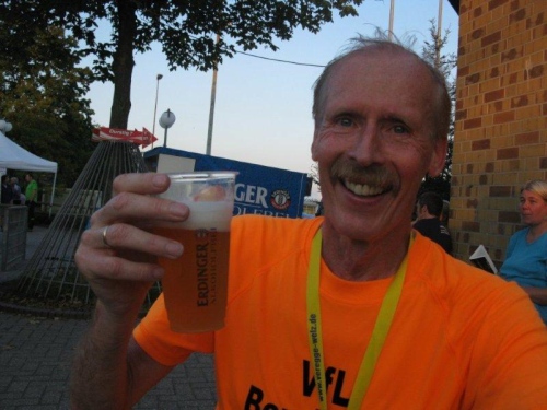 Ich erhalte eine Medaille und kann die Urkunde und Ergebnisliste später aus dem Internet ausdrucken. Hier im Ziel kann man sich nochmals verpflegen und zur Belohnung für die Anstrengung gibt es ein alkoholfreies Weißbier. Ich komme mit Jürgen Lehmann ins Gespräch. Auch er musste heute der Strecke ein wenig Tribut zollen, ist aber auch von der Veranstaltung sehr angetan.