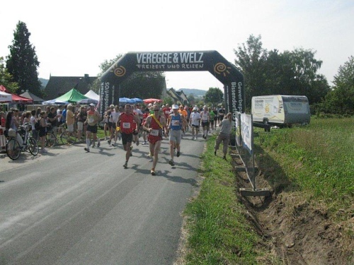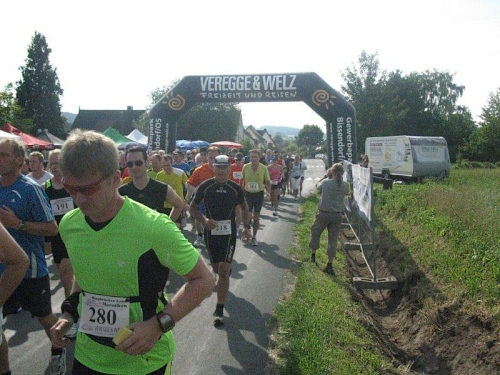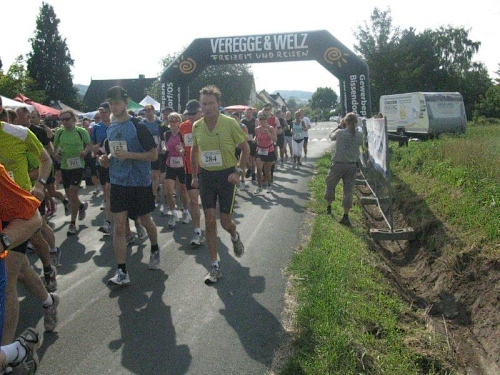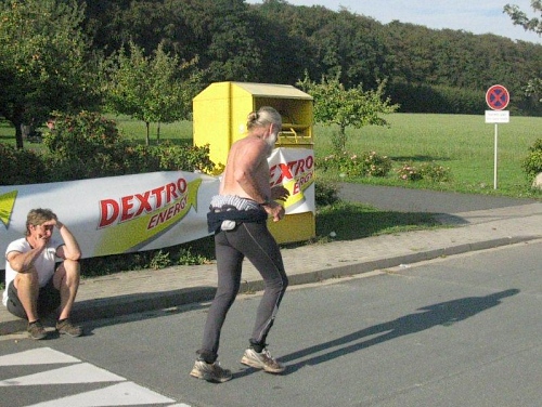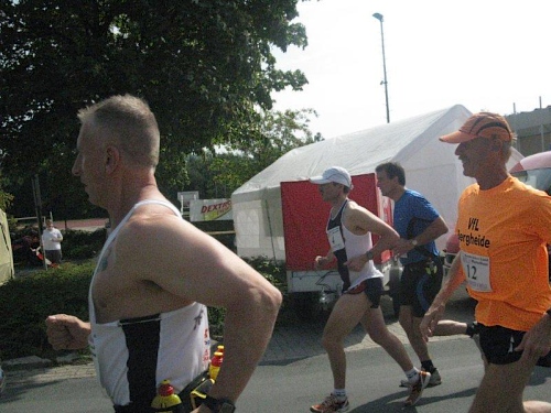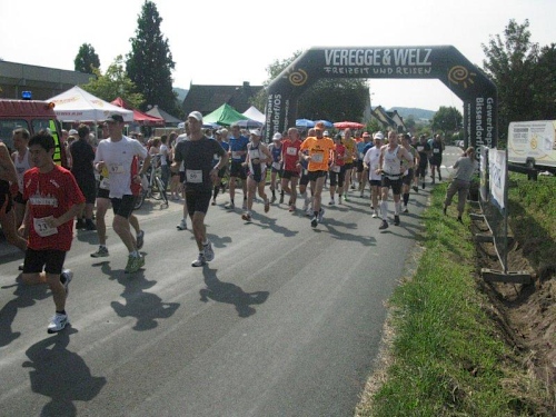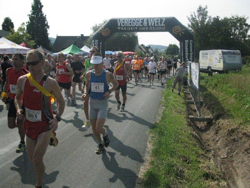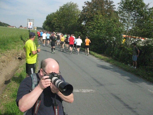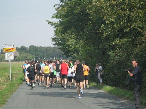 Auf der Marathonstrecke bekommt man einen schönen Eindruck von der reizvollen Landschaft. An Wald und Feld vorbei führt die Strecke durch kleine Ortschaften und an vereinzelten Bauernhöfen vorbei. Das Läuferfeld hat sich schon bald in kleinere Gruppen aufgeteilt in denen man sich munter unterhält. Da wird von den vergangenen Läufen genau so erzählt wie von den noch geplanten Heldentaten. Wenn die Läufer bei ihrem Lieblingsthema sind vergeht die Zeit ziemlich rasch, und schon bald erreichen wir die erste Verpflegungsstelle. Alle 4 bis 5 Kilometer gibt es hier eine solche und dazwischen sind noch Wasserstellen eingerichtet. Mit Wasser, Mineralgetränken und Obst wird man hier gut versorgt. Da die Strecke nicht allzu viel Schatten bietet ist eine gute Versorgung im Sommer auch wichtig. Die medizinische Versorgung wird von einem Arzt auf einem Motorrad übernommen. Über Hasetal und Kuhdamm geht es zur nächsten Verpflegungsstation und diese Wegenamen beschreiben schon ganz gut die schöne Strecke.