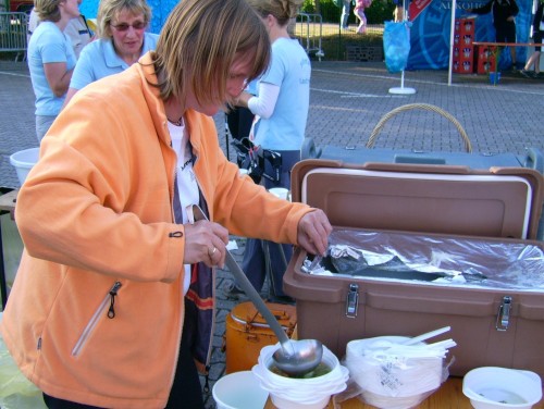 Nach dem Duschen gibt es kostenlos eine leckere Gemüsesuppe und alkoholfreies Bier ist auch im Angebot. Wir schauen uns noch den restlichen Zieleinlauf an und genießen die familiäre Atmosphäre. Besonderen Beifall erhält nochmals Gert Kabbert für seine tolle Leistung in der M80.