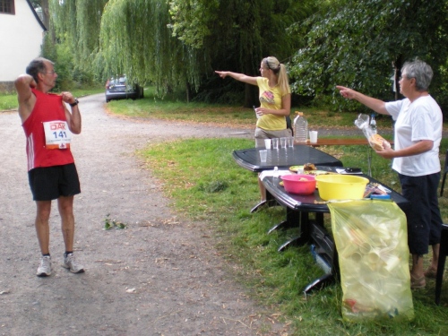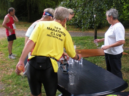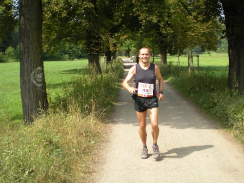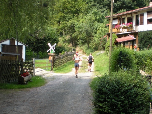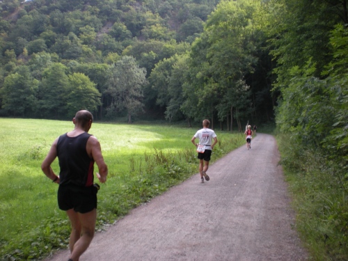 1. Unerwartet harter Lauf. Ich habe mit vielen Ultras gesprochen, wir finden keine eindeutige Erklärung, warum er so schwer war. Es muss der stete Wechsel des Schwierigkeitsgrades sein, man glaubt ein lockeres Samstagsläufchen in einsamer Natur zu machen, läuft teilweise zu schnell, kämpft sich denn entkräftet nach oben und überschlägt sich bei den Abwärtspassagen. Brennesseln und Dornen, Wurzeln und Steine fordern zusätzlichen Blutzoll. Extrem unterschiedlicher Untergrund erfordert wechselnde Trittarten und belasten sämtliche Muskelgruppen und Knochen. Der Temperaturunterschied zwischen Start (10 Grad) und Ziel (30 Grad) schlaucht zusätzlich, die wirkliche Entfernung war denn auch 71 Kilometer, was aber für einen Ultra kein Problem darstellt. Erwähnenswert ist aber doch die schattige Wegführung durch unterschiedliche Vegetationsformen, also nicht nur fader Hochwald, sondern wirklich sehr abwechslungsreich. Unterwegs gibt es verlockende Biergärten und Gasthöfe.