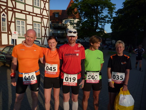 In Alexisbad ist der Start des Marathons und der Ort, der noch Zimmerkapazität hat. Um von dort nach Stiege, dem Start des Ultras zu kommen, stelle ich mich um 5:45 Uhr an die Straße und halte den Daumen raus. Vollbremsung. Ich weiß nicht wer lauter war, der Hund oder seine Frau. Der Hund jedenfalls hat mir das Ohr geschleckt. Fragt mich nicht, was der zum Frühstück hatte, ich glaube einen verwesten Hasenpelz. Sein Herrchen, der uns allseits bekannte großartige UltraJörg war jedenfalls dreifacher Helfer für mich: Mitfahrgelegenheit, Spender eines Rückfahrt-Shuttle-Tickets und Scout an der Stelle, wo fast alle falsch gelaufen sind.