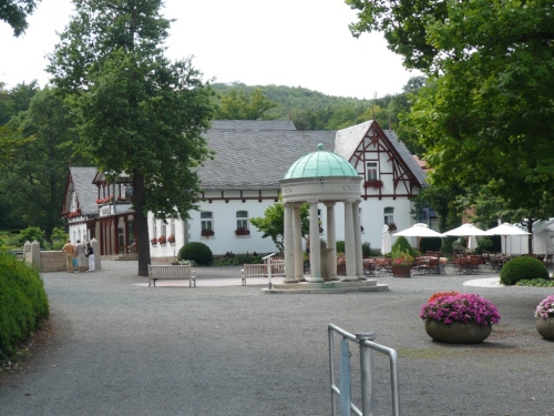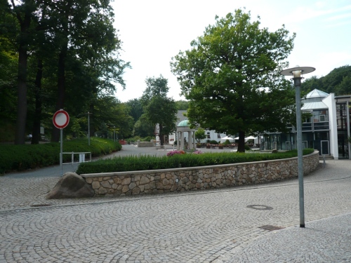 Wir umlaufen den Ort am Waldrand parallel zum Panoramaweg weiter in westliche Richtung. Es geht bergab und wir kommen auf einen eingesäumten Waldweg direkt durch den Park in die Stadt Bad Suderode. Links von uns liegt der Behringer Brunnentempel, der zu den stärksten Calciumquellen Europas zählt. Wir durchlaufen den Ort abwärts und bewundern das Ensemble von Gründerzeithäusern im sogenannten Bad Suderöder Pensionshausstil. Im Ort auf dem Bleicheplatz gibt es eine Versorgungstation. Die Ankommenden werden namentlich begrüßt, die Getränke von netten, in Tracht gekleideten Damen gereicht.
