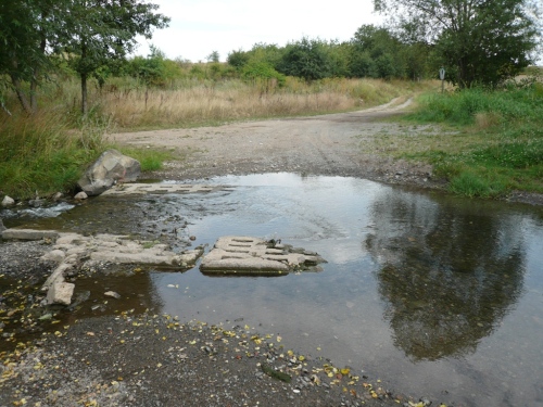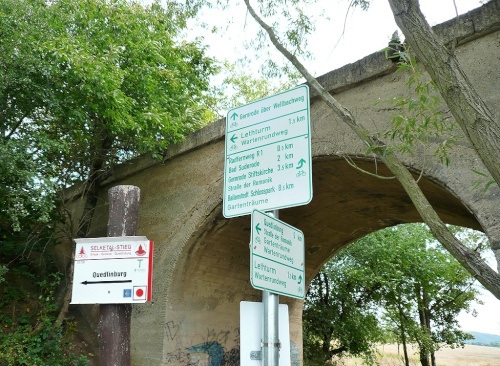 Wir sind auf einem Wirtschaftsweg und die Sonne zeigt uns, dass noch Sommer ist. Links am Weg liegen Schrebergärten, weiter rechts ein ländliches Anwesen. Wir sind vom Ortsende Bad Suderode ca. 1,5 km entfernt und kommen an eine Furt neben der Dreibogenbrücke. Nein, wir müssen nicht durchs Wasser. Hinter der Brücke führt ein Steg, auf dem wir auf die andere Seite des Quarmbachs wechseln. Wir folgen weiter dem Selketal-Stieg über den Radweg Richtung Quedlinburg. Vor mir sehe ich die ersten Plattenbauten und denke, das ist Quedlinburg. Aber es Quarmbeck, ein Ortsteil.