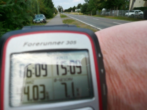 Wir durchqueren Bad Suderode auf kleinen Straßen parallel zur L 239, überqueren dabei die Bahnstrecke der Selketalbahn und verlassen den Ort an der Bückemühle. Wir laufen dem Quarmbach entlang. Meine Uhr zeigt 41,7km und ich denke noch, dass nach 500 Metern normalerweise der Marathon geschafft sei. Da steht in großen Zahlen auf dem Asphalt: Noch 4,5 km! Ich rechne nach: 41,7 + 4,5 = 46,2. Hatten die Damen im Hagental doch recht? Aber warum sagt dann der Veranstalter nicht, dass der Ultra 71km und der Marathon 46 km lang ist? Das haben doch im letzten Jahr die Läufer auch schon festgestellt.