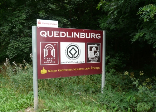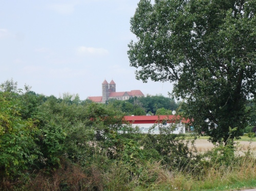 Beim Blick ins Tal nach Gernrode sehen wir in der Stadtmitte einen zweitürmigen hellen Kirchenbau Es ist die Stiftskirche St. Cyriakus, einer der am besten erhaltenen ottonischen Sakralbauten in Deutschland. Wir sind auf dem Weg der Ottonen zu ihrer Osterpfalz Quedlinburg.