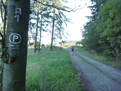 Der Gebirgszug heißt jetzt “Im Ebbe”, führt oberhalb der Oestertalsperre entlang, leicht bergab, und erinnert mich an die Strecke beim Uewersauertrail. Einmal drumherum und endlich wieder aufwärts. Endlich, weil man dann gehen darf.