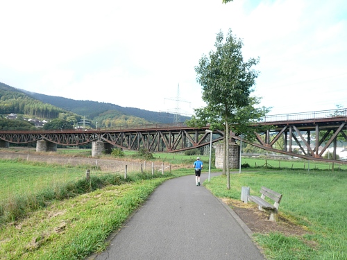 Dann wieder auf dem Uferweg, es geht über zahllose Brücken, immer die Seite wechselnd. Schwüler Nebel liegt über dem Wasser. Die Sonne ist unangenehm heiss. Keine Zuschauer, kein Wunder, alles was gehen kann steht als Order an der Strecke. Das habe ich noch nicht erlebt, alle 100 Meter ein, zwei Ordner, sichern, informieren, klatschen, rufen, absolute Begeisterung, die ich gleich nochmal erwähnen werde. Im Sauerland haben die samstags eine unangenehme Eigenart: Sauerbraten, Sauerkraut und Klöße. Oh wie das hier duftet!