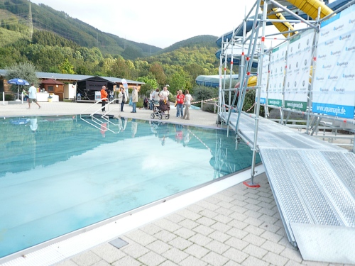 Ich frage, wo wir hier sind, kann mir die Namen der Orte aber nicht merken. Und dann sehe ich die riesigen Wasserrutschen. Aqua Magis, europaweit der erste Wasserrutschenlooping. Wir sind also durch Böddinghausen und jetzt in Ohle. Und wie geil ist das denn? Wir laufen durch das Erlebnisbad, durch die Dusche, über eine Metallbrücke über das Wasserbecken, eine Ehrenrunde über das Gelände. Absolut geile Idee! Ich lache mich krumm und schief, das ist der absolute Hit. Ich stelle mir vor, wie morgen die Mountainbiker hier durchfetzen, einfach cool.