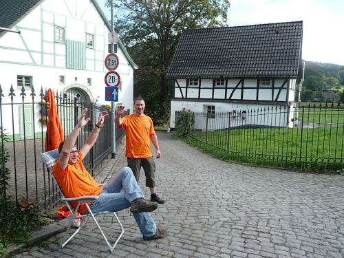 Die Streckenführung ist neu. Kaum Orientierung, irgendwann ins Tal gekommen, erst spät sehe ich ein Ortschild, wir waren kurz in Blemke, es ist wieder das Tal der Lenne. Sehr schönes Tal. Kilometerweit laufen wir am Flußufer entlang. Dann Umleitung, weg vom Uferweg, durch den Vorgarten, zwischen Zäune und Garagen. Was ist hier los? Zahlreiche Ordner weisen mit Flaggen den Weg, Rot-weisse Bänder bilden schmale Gasse. Und dann muss ich herzlich lachen: Wir laufen über das Gelände eines Altersheimes. 100 Meter Zick-Zack-Umweg und dann sowas! Da sitzen die Alten wie in Käfigen hinter dem Balkongitter und heben schwach eine Hand zum Gruß. Wie geil ist das denn! So ein Lauf kann auch Freude schenken! Absolut geile Idee! Ich hoffe nur, dass die Alten nach uns nicht in die Langeweile zurückfallen. Bekämen die nicht nur Brei, ich hätte gerne ein Bier mit den Gebrechlichen getrunken.