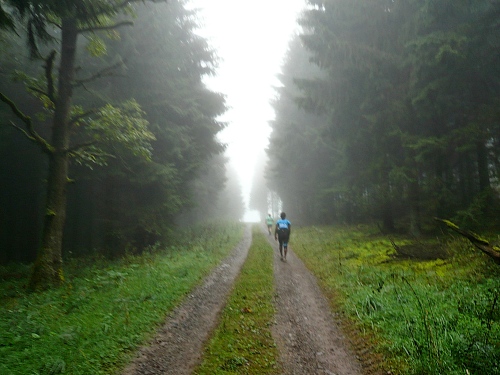 Am Talgrund gelangen wir in den kleinen lieblichen Ort Pasel, am niedlichen Flüßchen Lenne. Links oben der Engelbertstuhl ( siehe Bericht 2009 ) und die Schwarzenburg. Auf der anderen Seite die Hohe Wibbecke, Richtung Ruthenberg wo wir hoch müssen. 20% Steigung und schwül-warme Luft, oben dichter Nebel, ich bekomme kaum Luft, die Schuhe sind nass, was für eine Quälerei!