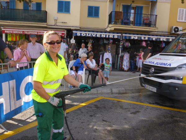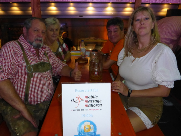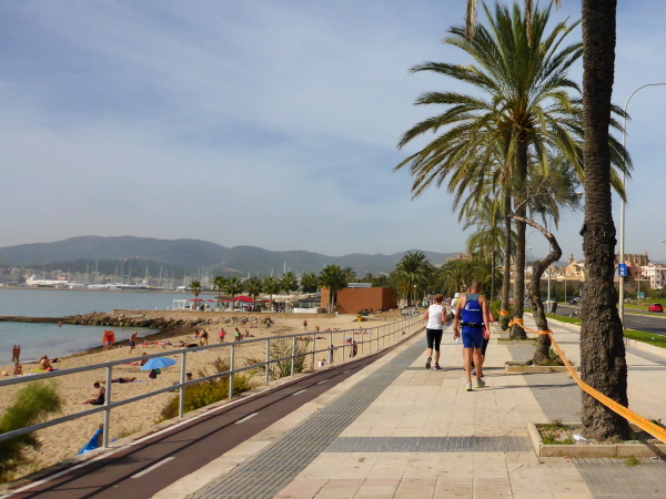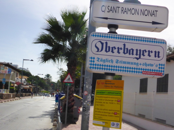 Eine Stunde später: Große, in deutsch geschriebene Speisekarten kündigen es an. Wir kommen nach Arenal (= Sandfläche). Links das „Riu Palace“, Revier von Mickie Krause, eigentlich Michael Engels, der Schlagerstar, der mit 15 Jahren zum Bravo-Boy gewählt wurde und mit „Zehn Nackte Friseusen“ seinen Durchbruch hatte. Er hat gerade den Halbmarathon in 1:29 gefinisht. Alle Achtung! Und das mit voller Frisur!