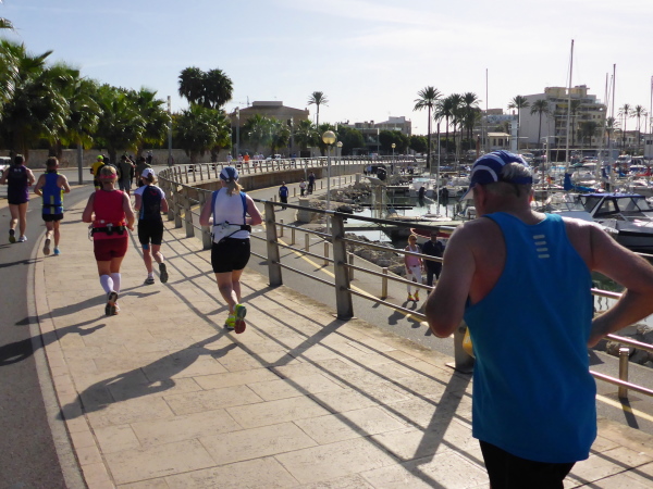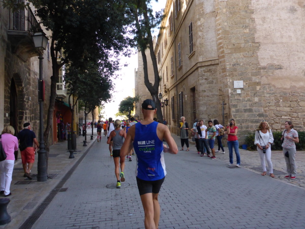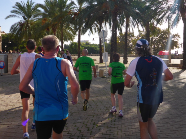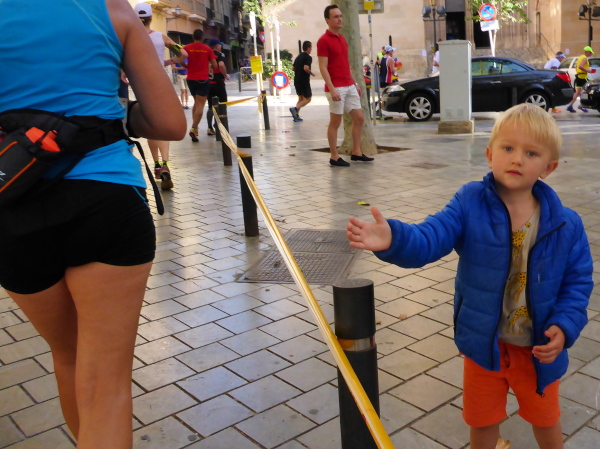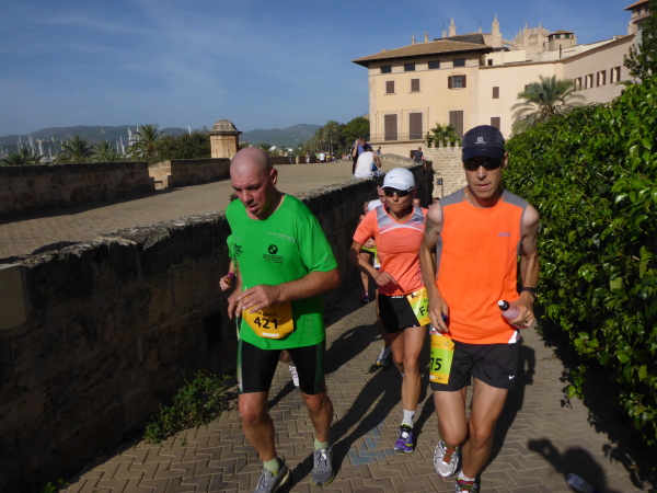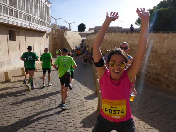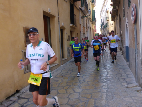 Die Laufstrecke geht jetzt kurz über beide Ufer des Torrent Sa Riera entlang. Das ist ein Kanal, der vor 400 Jahren gebaut wurde. Der eigentliche Fluß führt zwischen dem Passeig des Born und der Rambla. Über einen Bogen geht es über die Ringstrassen, die den Verlauf der früheren Stadtmauer erkennen lassen, dann tauchen wir über die Carrer de Sant Miquel in die Altstadt ein. Der Placa Major (km 15) bietet grandiose Stimmung, mit Moderator, Musik und Cheerleader. „Scheiß drauf! Marathon ist nur einmal im Jahr“ steht topaktuell auf dem Shirt meines Vorläufers. Mir geht der Song von Peter Wackel nicht aus dem Kopf. Allein dieser Titel ist schon ein Hit!