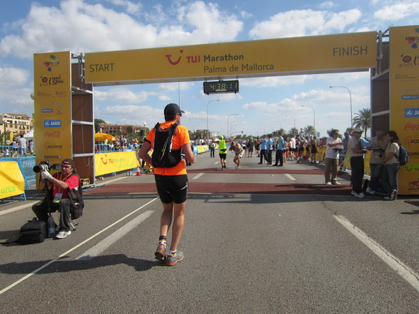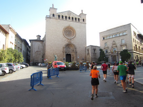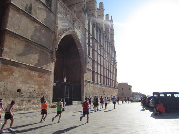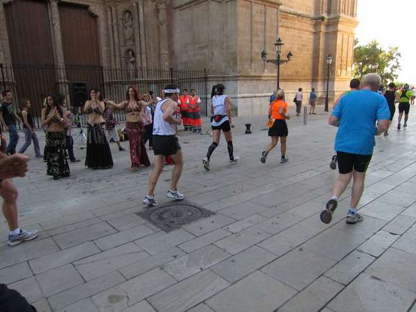 Weiter geht es an einem der größten gotischen Kreuzgänge Europas vorbei, der Kirche San Francesc. Für manchen ist der Marathon wohl hier bereits mehr Kreuzweg als Wallfahrt und manche kämpfen wohl noch mit der Umstellung von Flip-Flops auf Laufschuhe. Es gibt Prozessionsmärsche, an denen wird nachts von Palma aus zur Schwarzen Madonna im Kloster Lluc gelaufen und nicht jeder schafft diesen Marsch. So wird es wohl auch heute sein. Zwischen Brunnen, Blumen und Säulen scheint die Zeit gebannt zu sein, wären da nicht die schrillen, heftigen Schreie der Anfeuerung. Eine Gruppe Flamencotänzer macht Stimmung. Ein Flamencotänzer nimmt mich in den Arm, um mit mir zu tanzen. Kay ist mit den Flamenco-Damen beschäftigt und so kann er meinen tänzerischen Einsatz nicht fotografisch festhalten.