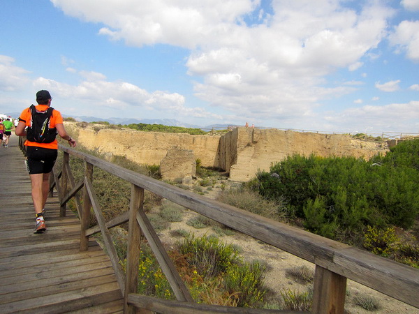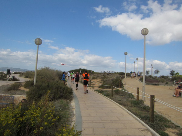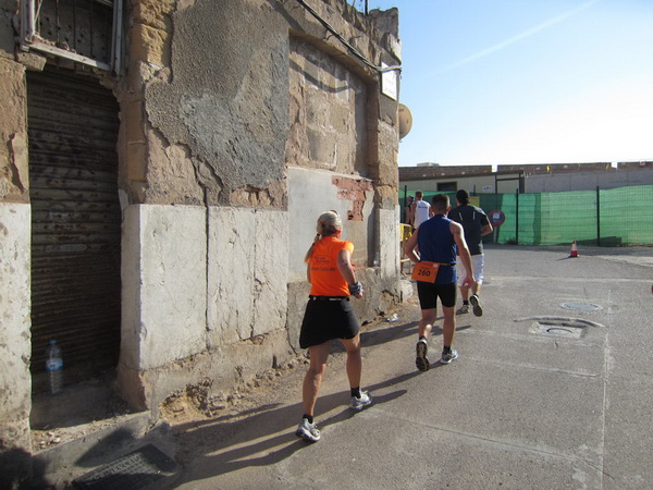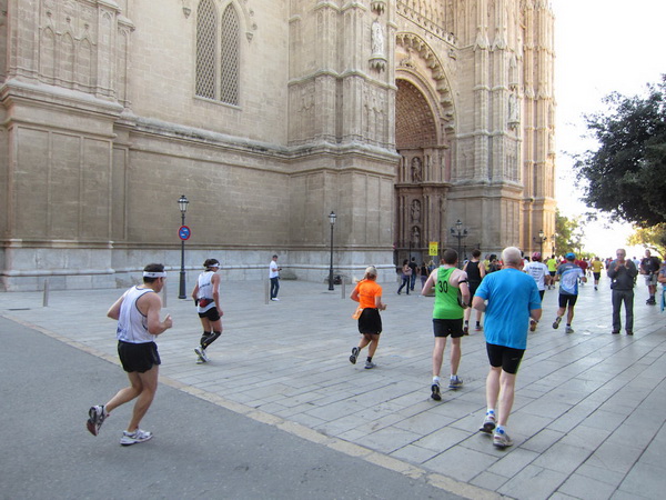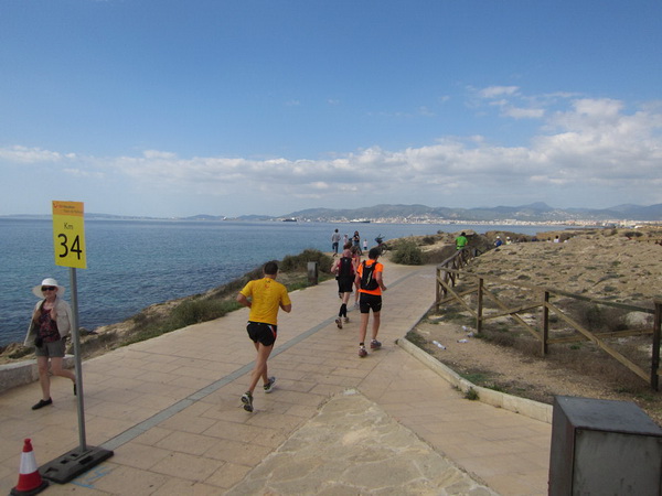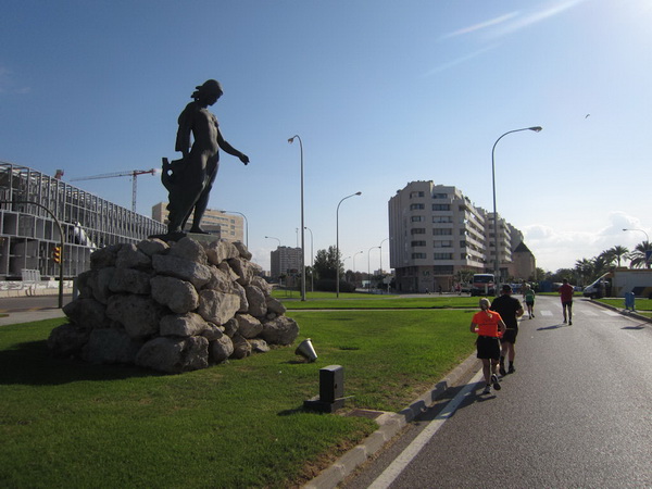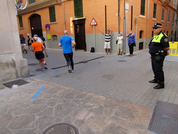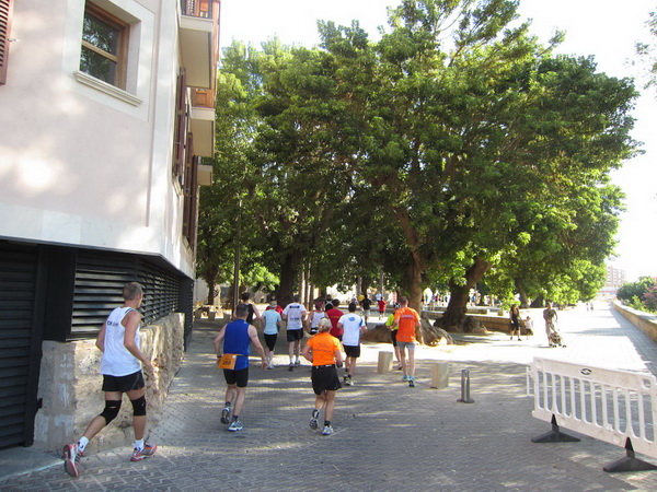Hier an der Stadtmauer bei Kilometer 20, teilt sich die Strecke. Während die Halbmarathonläufer Richtung Kathedrale laufen, geht es für uns in Richtung S´Arenal. Ich dachte, hier wären wir ihn los, den Porno-Läufer. Sein Outfit entspricht nicht dem Dresscode für einen Marathonlauf. Details werde ich hier nicht schildern, er posiert oft genug vor unserer Kamera und er ist auch nicht abzuschütteln. Vielleicht sollte man solche Exemplare in die Stierkampfarena stellen. Dort hätte er sein Publikum und im Gegensatz zu den Stieren hätte er noch seine Freude daran. Olè.