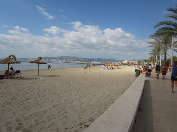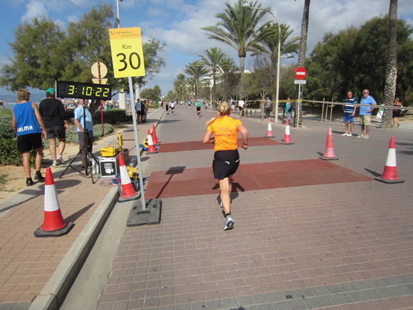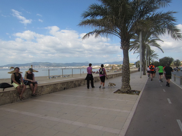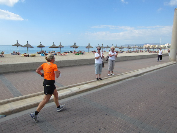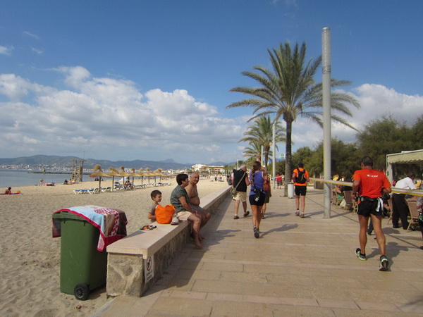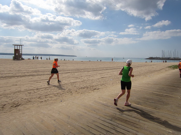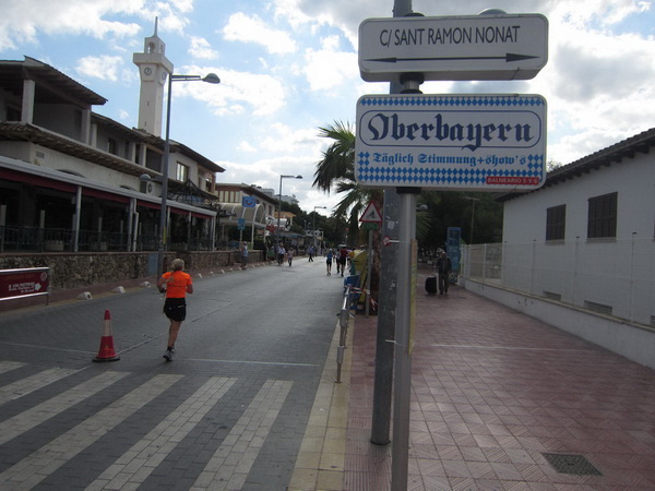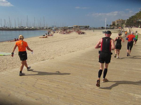 Zahllose Urlauber schauen sich die stundenlang dauernde Prozession nun schon an. Überwiegend in deutsch sind die Anfeuerungsrufe. Drei Jungs, Chinesen mit Lederhosen, kariertem Oberhemd und Tiroler-Hut, verteilen Flugblätter. Werbung für das Oberbayern heute Abend. Rechts Bettenburgen, links das Meer. Wir laufen am sechs Kilometer langen Strand von Palma. Die Laufstrecke ist hier mit einem Band abgesperrt. Jetzt, für ein paar Stunden, ist hier alles ganz anders. Hier trifft sich die exzessive Laufszene. Ich stelle mir vor, wie an den Verpflegungsstellen der rote, alkoholfreie isotonische Fruchtpunsch mit bunten Strohhalmen aus Eimern geschlürft wird.