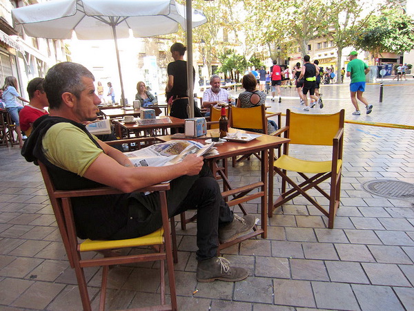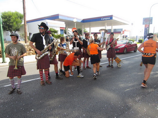 Wo sind sie denn, die ständig feiernden und andauernd betrunkenen deutschen Touristen, die ihren Mallorca-Kurz-Urlaub mit Feiern und Flirten am Ballermann verbringen? Es ist kurz nach 12:00 Uhr. Da sitzen welche, bei XXL-Schnitzel oder Riesencurrywurst. Wir stecken uns die mit viel Power gefüllten Fruchtgummis in der Geschmacksrichtung Lemon in den Mund. Aber auch der Geruch von Gambas in Knoblauchbutter kommt uns in die Nase, während wir die Bierstraße queren. Alles sieht aus wie eine verlassene Filmkulisse. Sonja Oberem ist auf ihren letzten Metern ins Ziel und wird auch dieses Jahr wieder gewinnen. Für uns ist bei Kilometer 30 der Wendepunkt erreicht. Bis zum Ballermann Nr. 6 führt uns die Strecke nicht mehr. Plötzlich, völlig unerwartet, ein Stimmungsnest!
