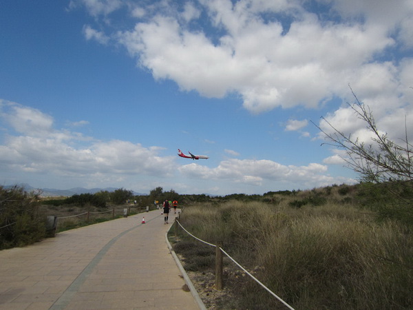 Bei Kilometer 26,5 KM erreichen wir Can Pastilla. Dies ist im Grunde ein Vorort von S’Arenal und verfügt auch über den größten Charterflughafen Europas. Wie schön ist doch die Anreise mit diesem Verkehrsmittel. War es im 19. Jahrhundert mühsam, nach Mallorca zu kommen, so ist die Anreise heute sehr bequem, vorausgesetzt, es wird nicht gestreikt. Es waren nur noch wenige Tage bis zum Marathon in Palma de Mallorca und dann kamen diese Nachrichten: „Chaos auf Mallorca befürchtet – Fluglotsen in Deutschland wollen doch streiken.“ Zum Glück ist es aber nicht so weit gekommen und so zischt, zum Greifen nah, über uns der gelbe TUI-Flieger. Schade, leider war gerade der Akku der Kamera leer. An der Carrer Manuela de los Herreros kommt man den Bewohnern des Meeres nah wie sonst nirgends. Wir laufen am tiefsten Aquarium Europas vorbei.