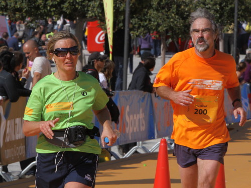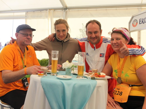 Inga erzählt: „Die Teilung in Marathon und Halbmarathon stand an. Normalerweise laufe ich ja immer den Lauf zu Ende, für den ich mich auch angemeldet habe. Aber leider bog keiner mehr zum Marathon ab und die Vorstellung, noch einmal 21km allein an übernächtigten Touristen und frierenden Spaniern vorbeizulaufen, erschien mir nicht verlockend. Da wollte ich doch lieber im TUI VIP- Zelt bei gutem Essen und Trinken sitzen“.