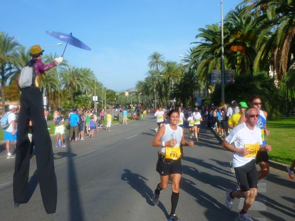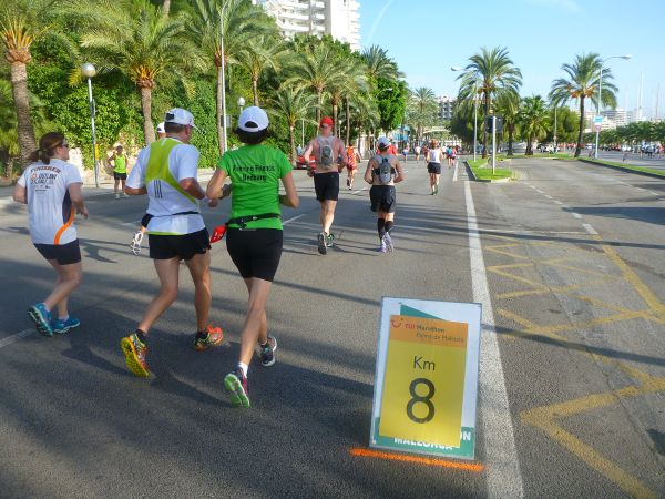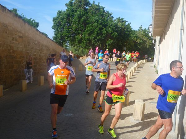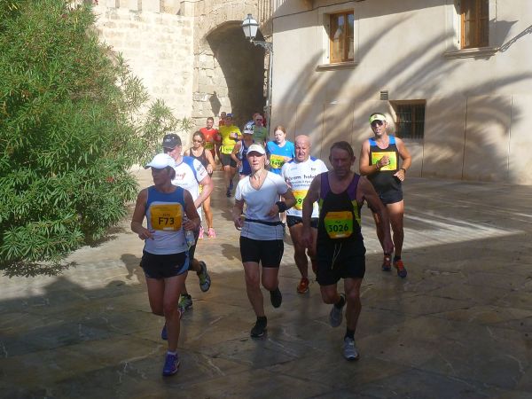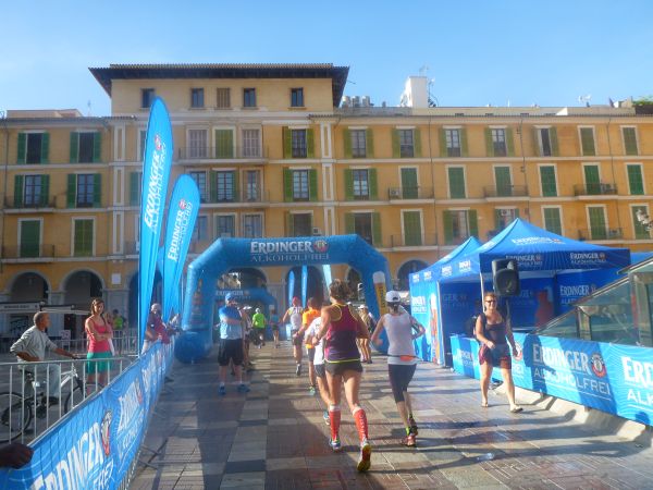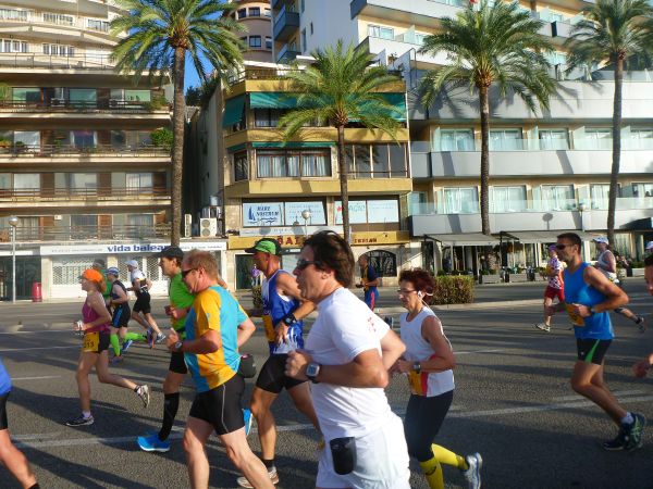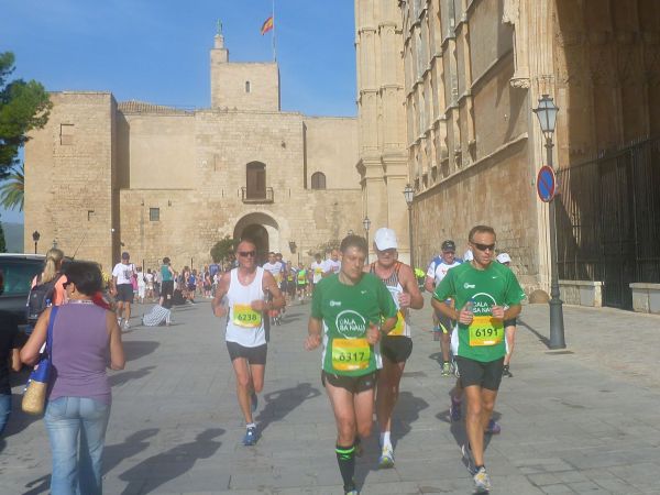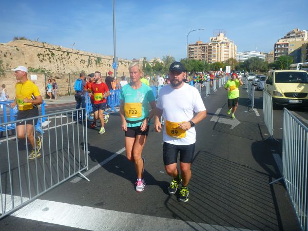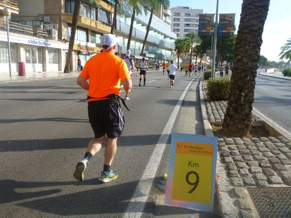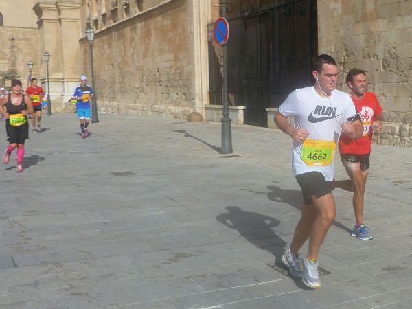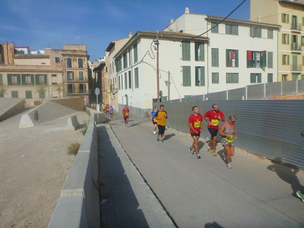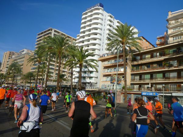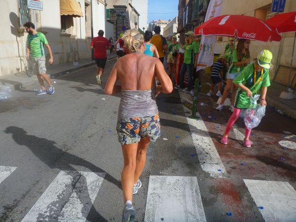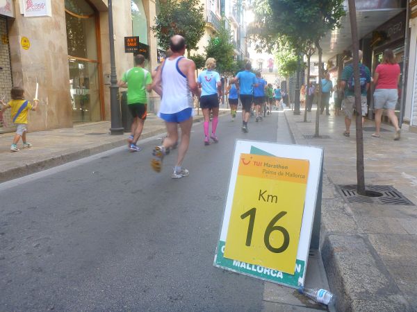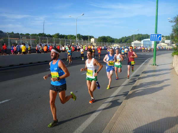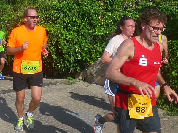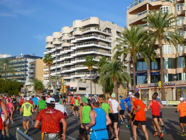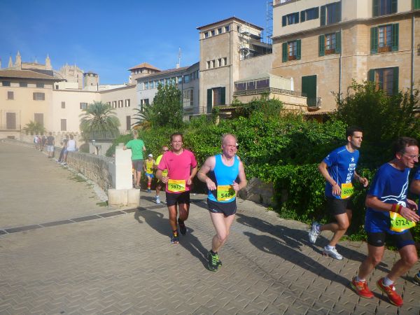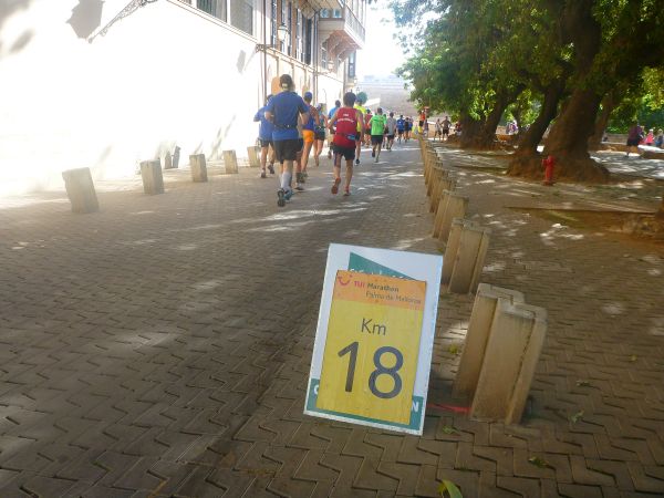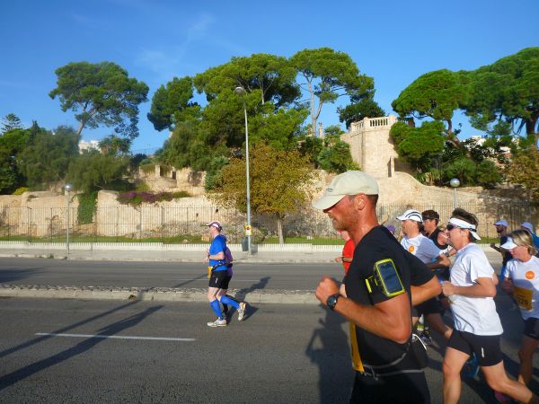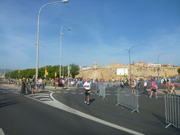 In der Altstadt wird es in den Gassen enger. Mittlerweile sind Massen an Halben im Feld der Marathonis unterwegs. Das ist nicht optimal. Nach einer Runde laufen wir wieder am Plaza Rei Juan Carlesi vorbei. Es geht nochmals aufwärts. Bei Km 13 überqueren wir den Torrente Sa Riera und sind wieder auf einer breiteren Straße und umlaufen die Altstadt. Die Strasse teilen wir uns teilweise mit Autos.
