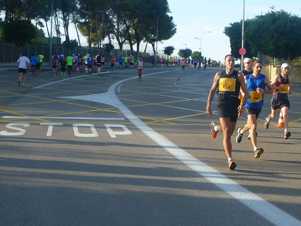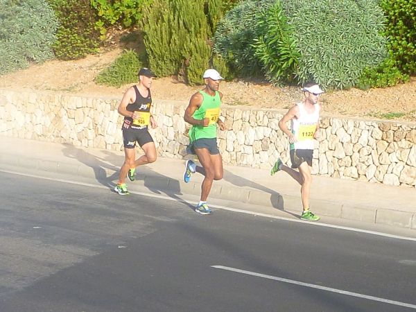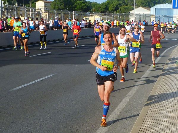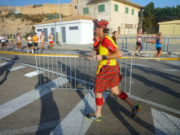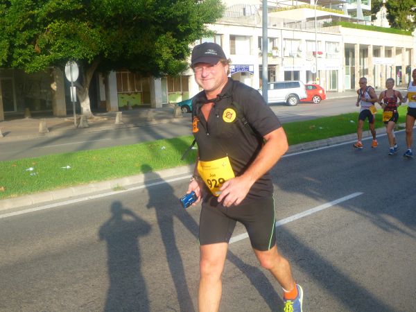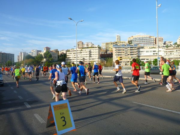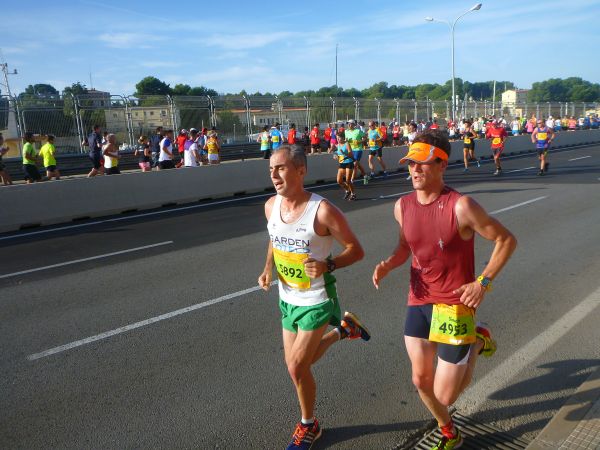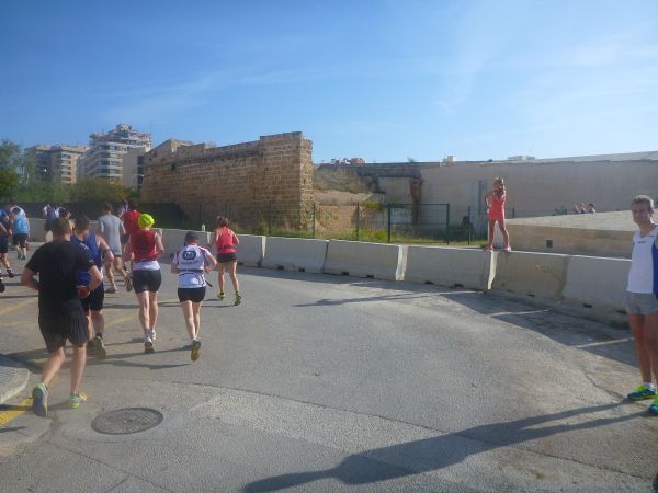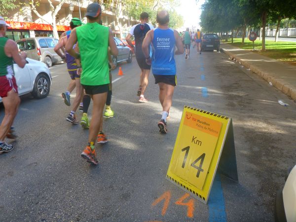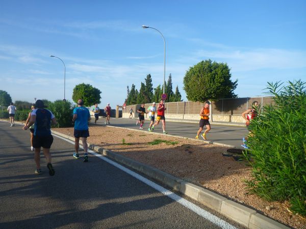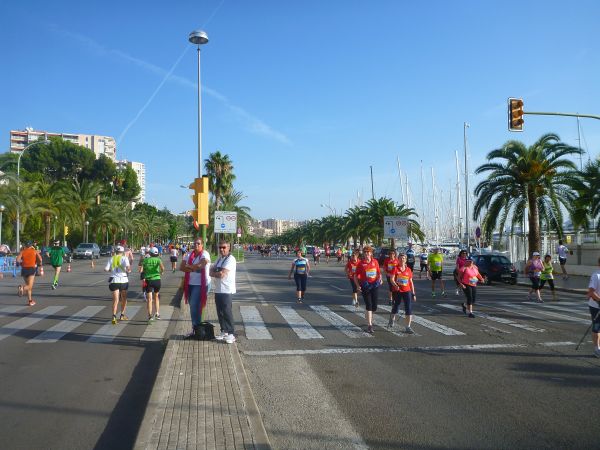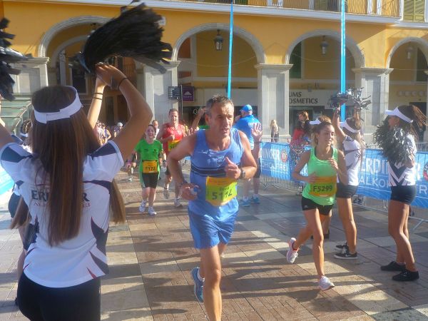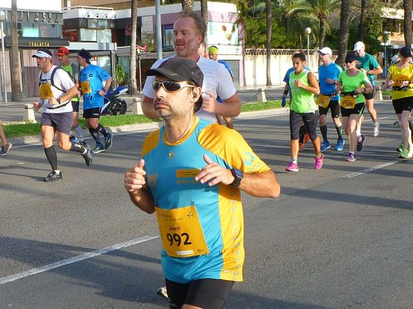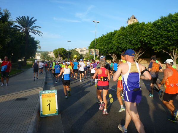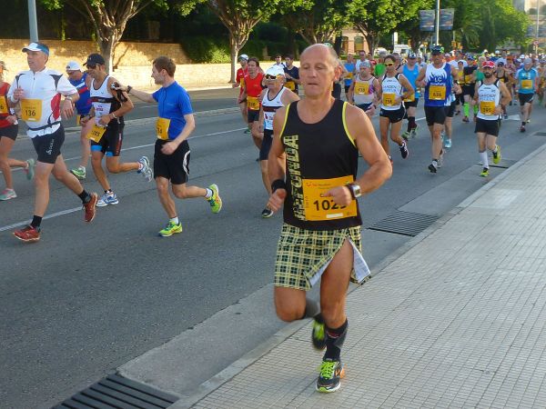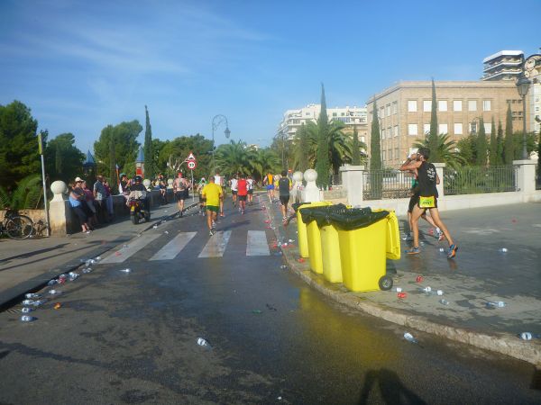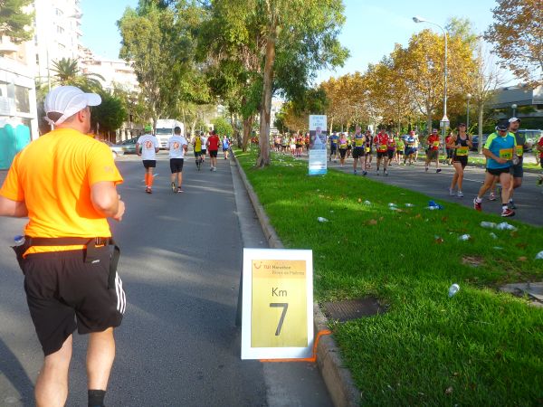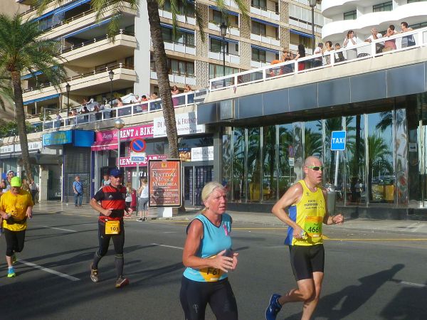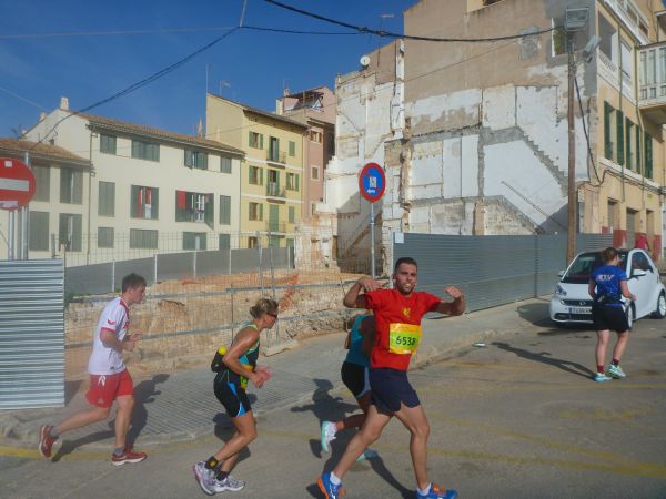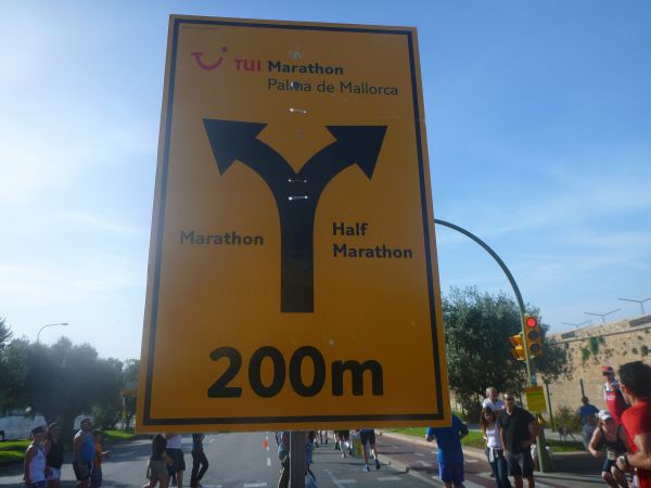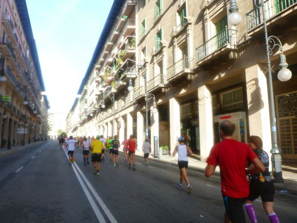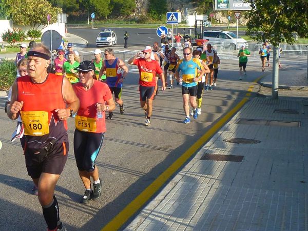 In der Altstadt wird es in den Gassen enger. Mittlerweile sind Massen an Halben im Feld der Marathonis unterwegs. Das ist nicht optimal. Nach einer Runde laufen wir wieder am Plaza Rei Juan Carlesi vorbei. Es geht nochmals aufwärts. Bei Km 13 überqueren wir den Torrente Sa Riera und sind wieder auf einer breiteren Straße und umlaufen die Altstadt. Die Strasse teilen wir uns teilweise mit Autos.
