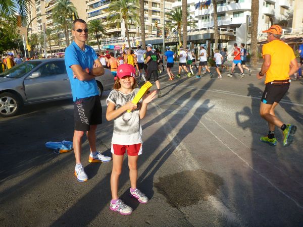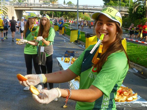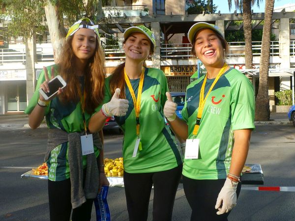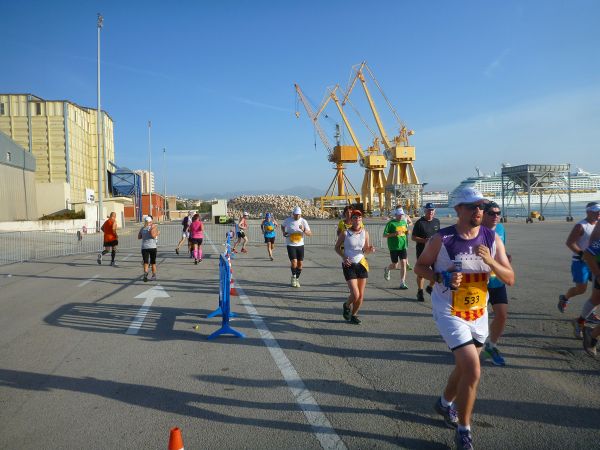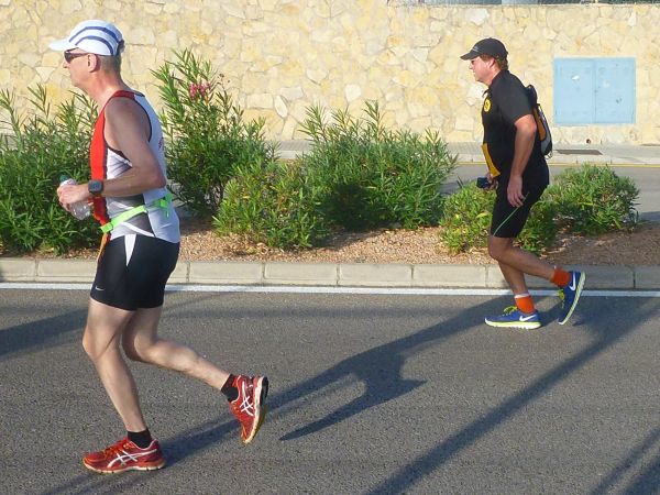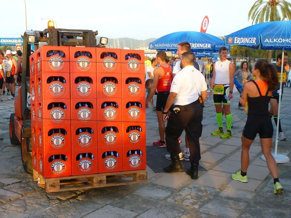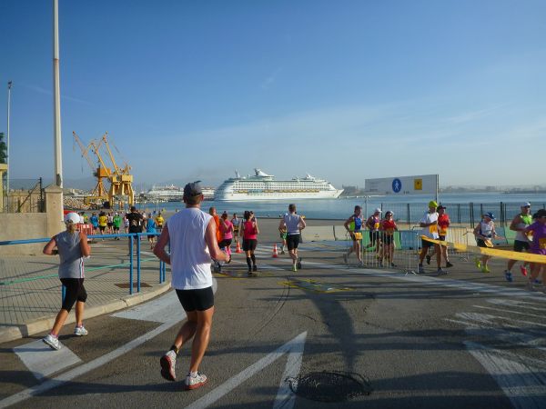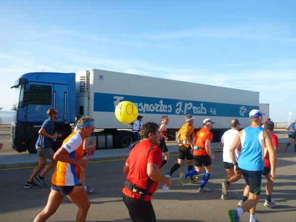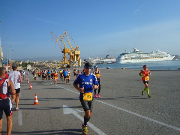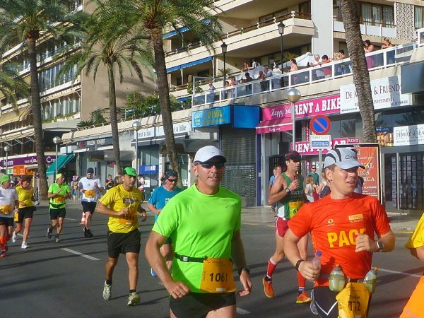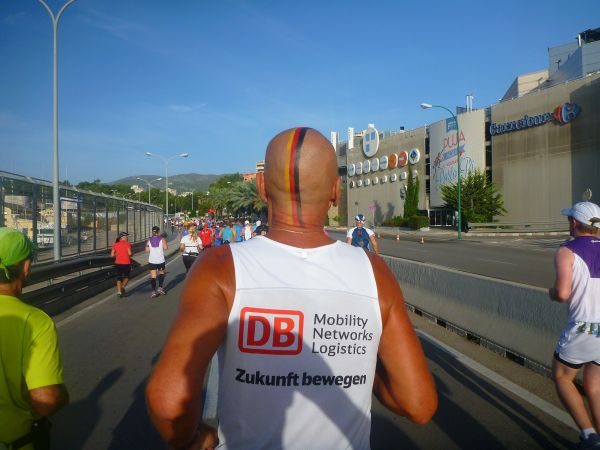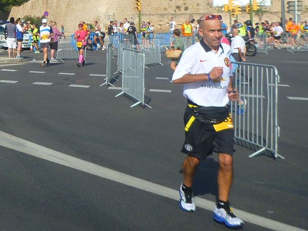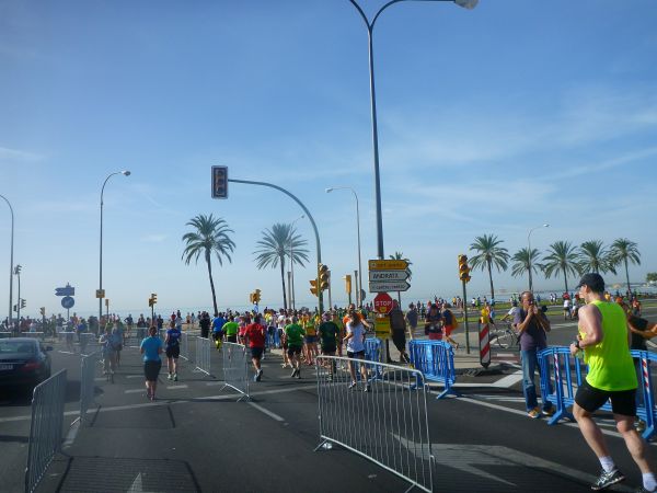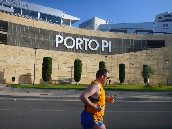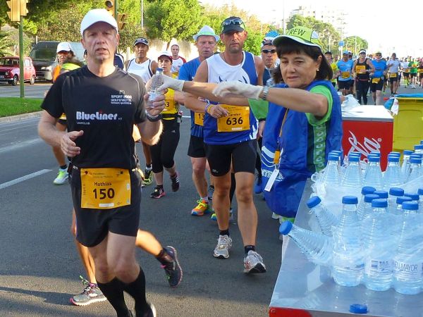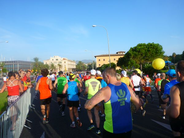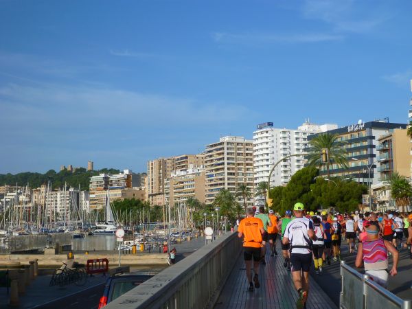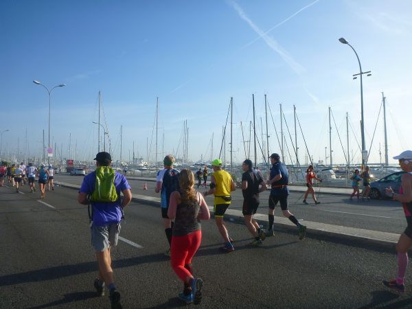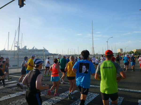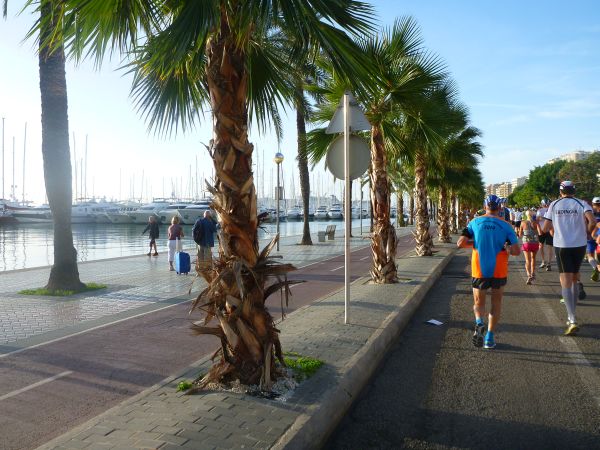 Wir laufen auf breiter Straße am Meer entlang. Links der Hafen mit Schiffen jeder Größe soweit das Auge reicht. Hier liegen schon einige Millionen vor Anker. Rechts die Hotelburgen mit Läden und Restaurants direkt an der Straße. Palma schläft jedoch noch. Außer den Marathonis ist keiner auf den Beinen. Halt, die vielen Helfer an der Strecke sind ebenfalls hellwach.