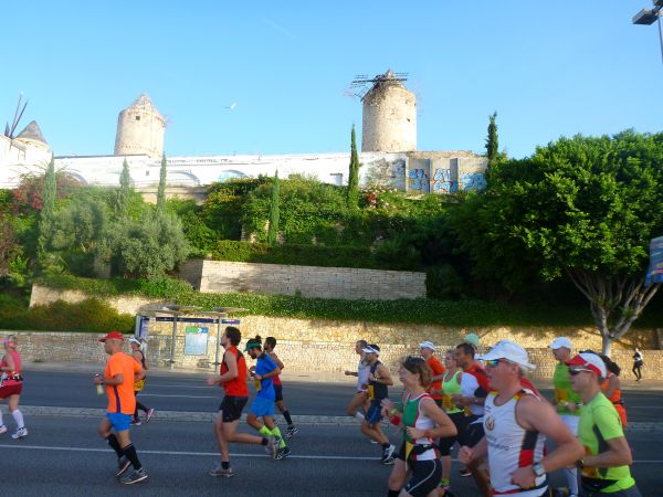 Noch sind die fast 1600 Starter dicht beisammen. Das Feld zieht sich jedoch rasch auseinander. Kurz nach Km 1 tauchen rechts zwei verfallene und danach zwei erhaltene Windmühlen auf.