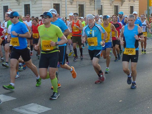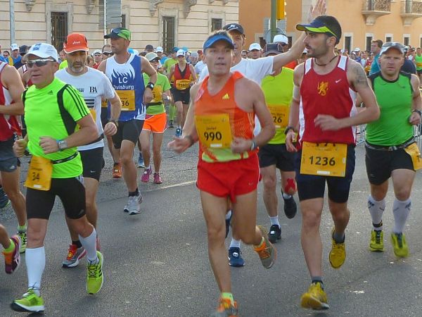 Ein markanter Turm taucht rechts auf. Und noch einer. Nein, das ist Joe. Klar, diesen Marathonspaß lässt er sich nicht entgehen. Und da ist auch schon die Spitze auf der Gegenseite im Anflug. Drei Läufer haben vor einigen Verfolgern schon einen netten Vorsprung erlaufen. Ich konzentriere mich lieber auf meine Seite. Und auf die erste Steigung, die es zu bewältigen gilt. Der Gegenverkehr nimmt mehr und mehr zu. Na ja, ich bin noch lange nicht letzter und heute heißt es angesichts der zu erwartenden Hitze einen kühlen Kopf zu bewahren. Den 4-Stunden Zugläufer lasse ich gegenüber passieren.