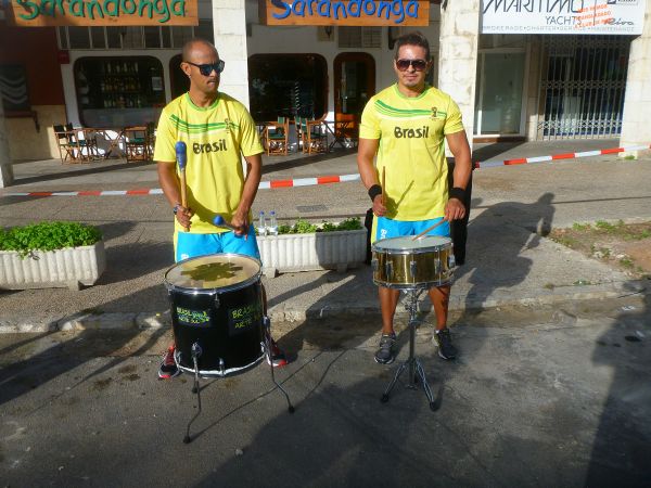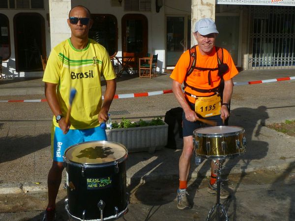 Als ich bei den beiden Trommlern bei Km 7 vorbeikomme, ist gerade eine Trommel frei und greife die Stöcke und schlage die Trommel. Rasch werde ich allerdings abgelöst und die Trommeln erklingen wieder im Takt.