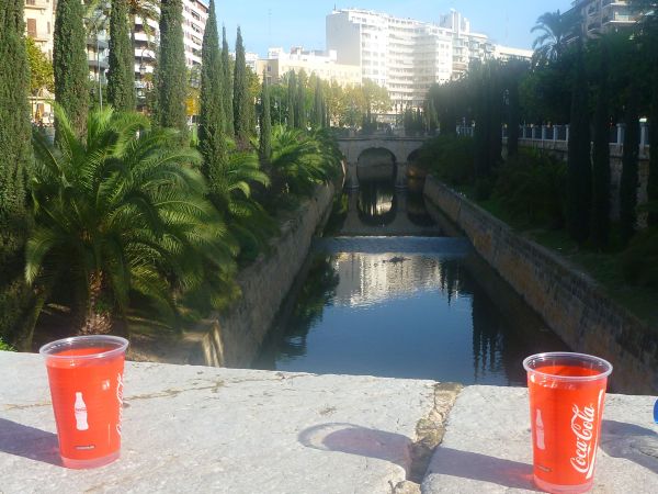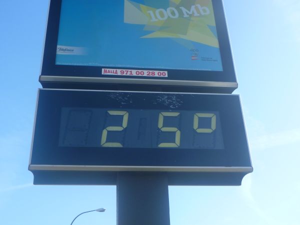 Als wir den Torrente Sa Riera wieder Richtung Altstadt überqueren stürzt vor mir ein Läufer in der Kurve. Gottlob ist nix passiert. Ein Thermometer zeigt an, dass wir nach nunmehr 90 Minuten Laufzeit bereits 25 Grad haben. Das kann ja noch was werden.