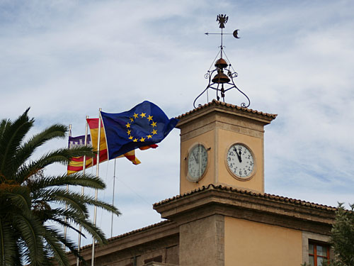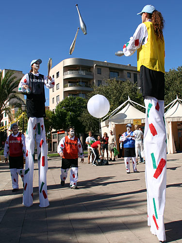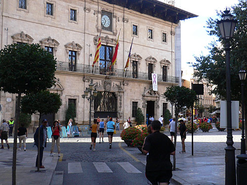 Der Passeig del Born, bekannt für seine Modegeschäfte, ist eine einzige Baustelle, denn die Grünanlage zwischen den beiden Fahrbahnen wird gerade erneuert. Von dort kommen wir zuerst zum Placa Mercat, dann zur Rambla mit den vielen Blumenläden und schließlich nach einer ersten Schleife durch enge Altstadtgassen zuerst in die Geschäftsstraße Avinguda de Jaume III. und dann nach einem kurzen Anstieg zum Passeig de Mallorca. Viele Fangruppen haben sich hier postiert und sorgen für gute Stimmung. Die Einheimischen bevölkern die Straßencafés und verfolgen von dort das Geschehen.